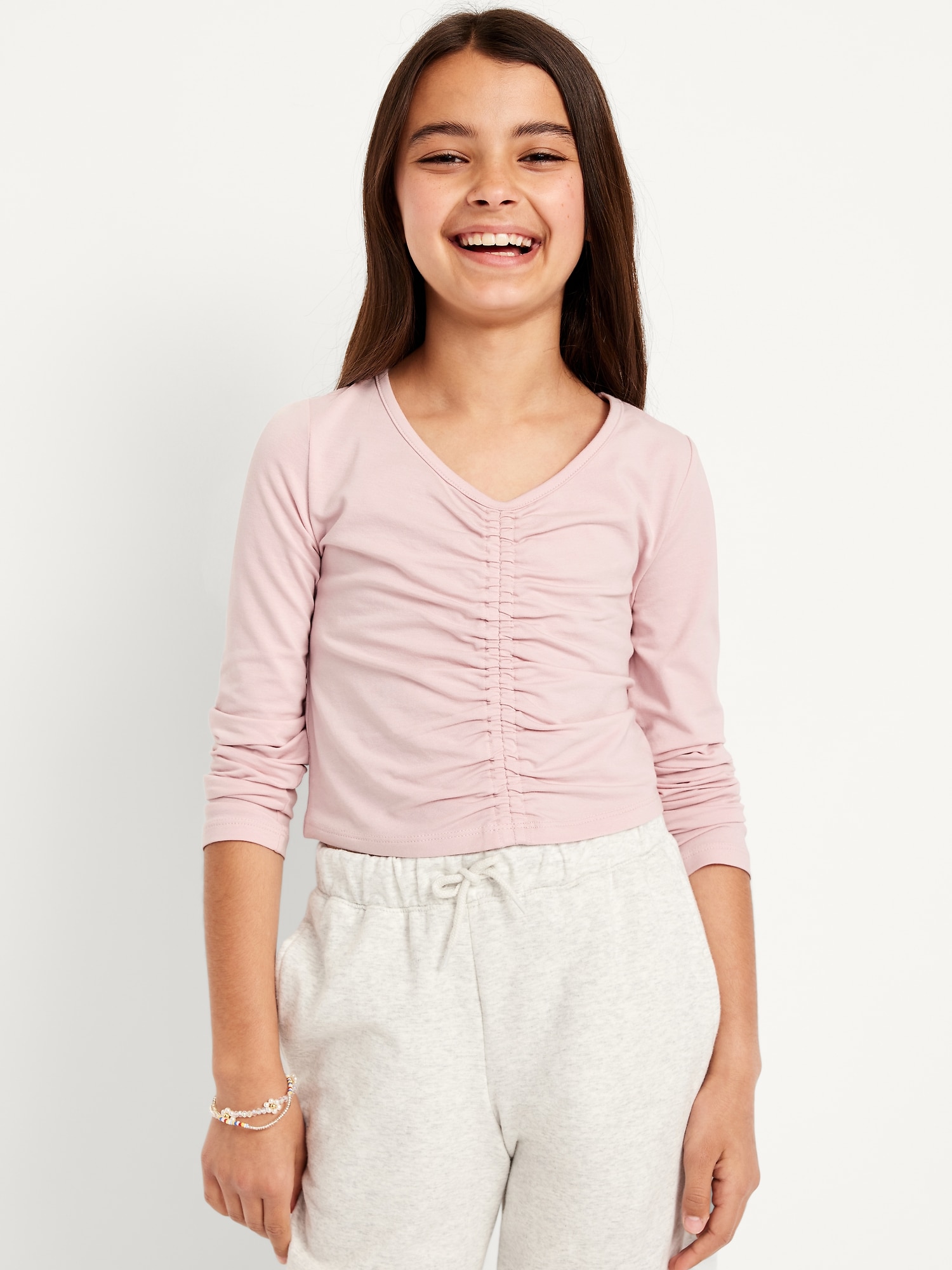 Fitted Long-Sleeve Ruched Top for Girls: v neck, long sleeves, ruching at center, online exclusive, #766950