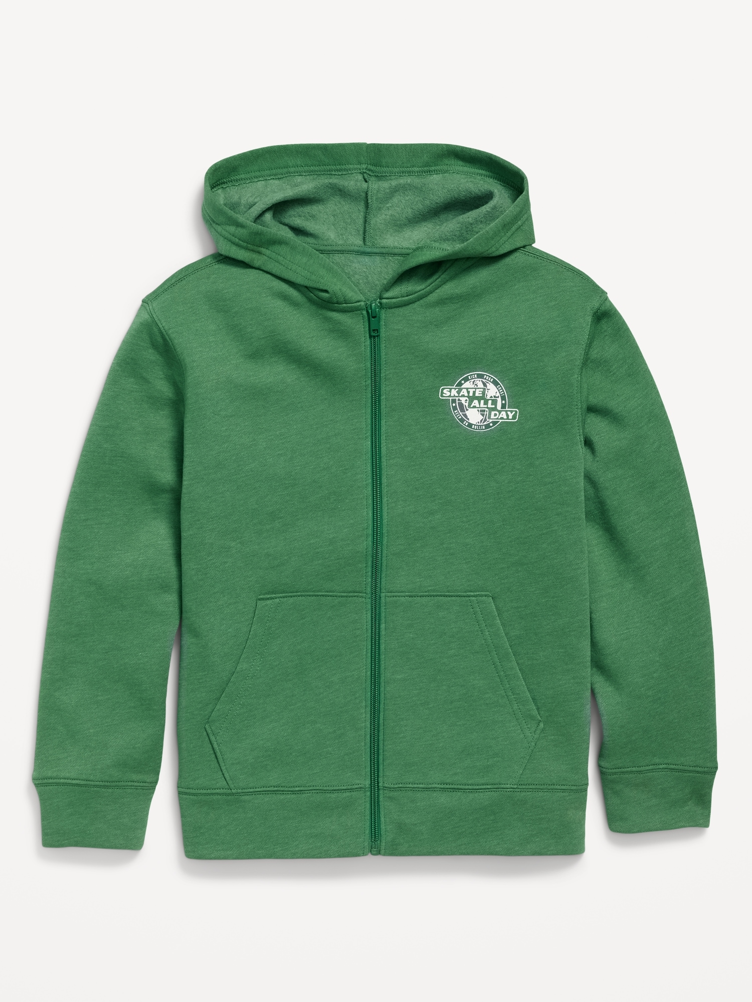 Fleece Zip-Front Hoodie for Boys: built-in hood, long sleeves, full length zipper, hand-warming pockets, banded hem, graphic at front or all-over pattern, #695612