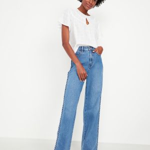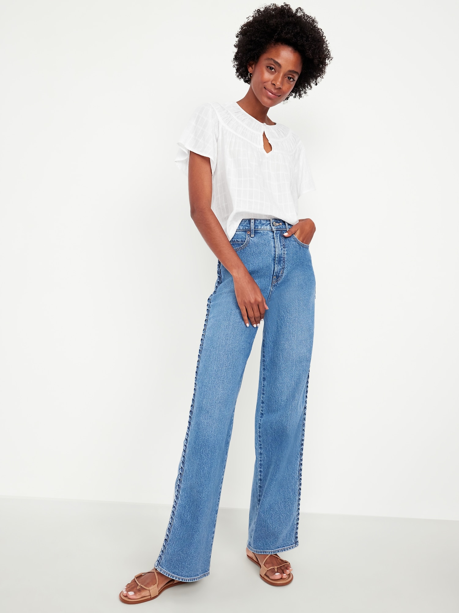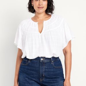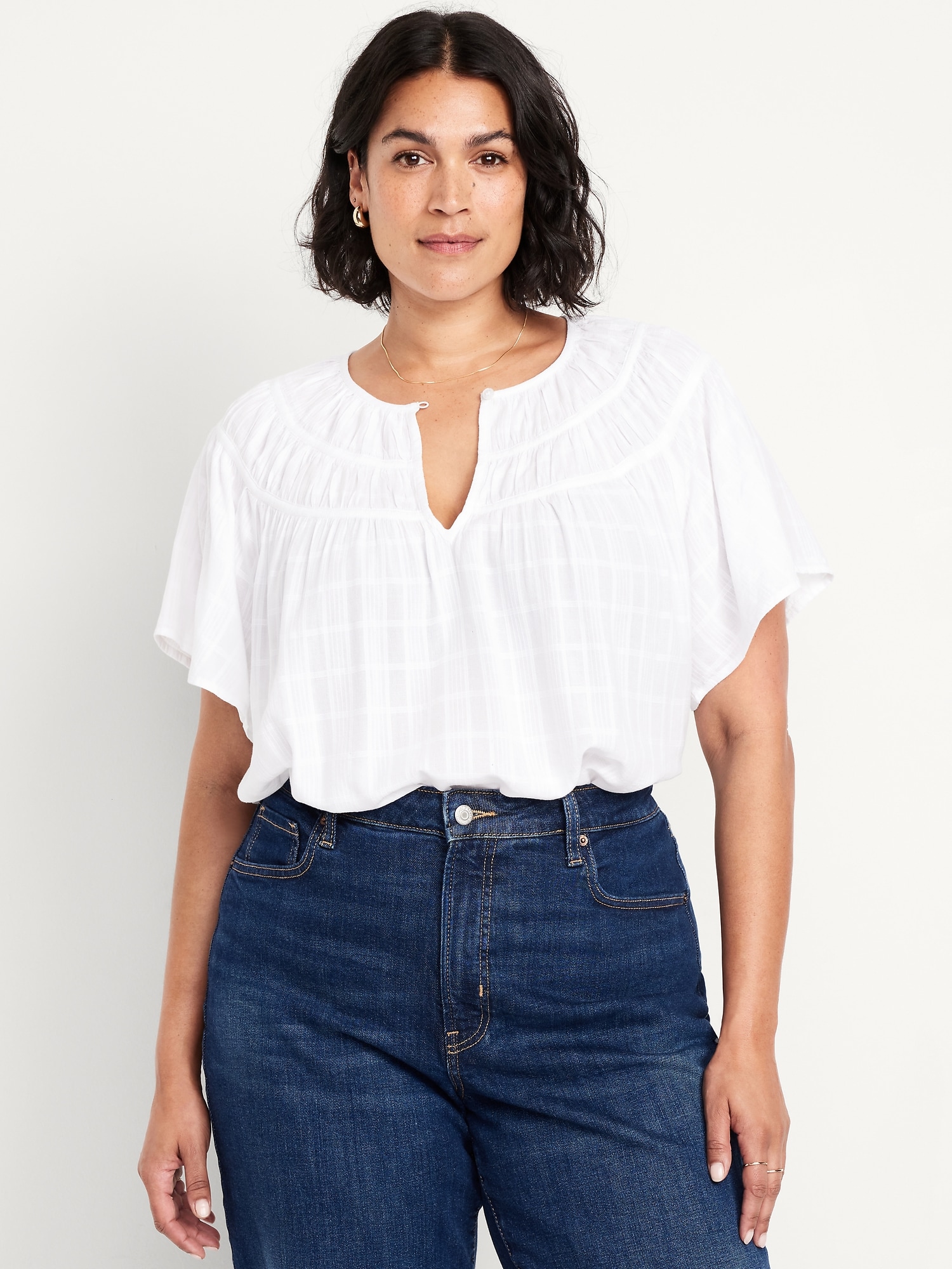 Flutter-Sleeve Dobby Top: shirred neckline, front button-loop keyhole closure, short flutter sleeves, floral print, #704186