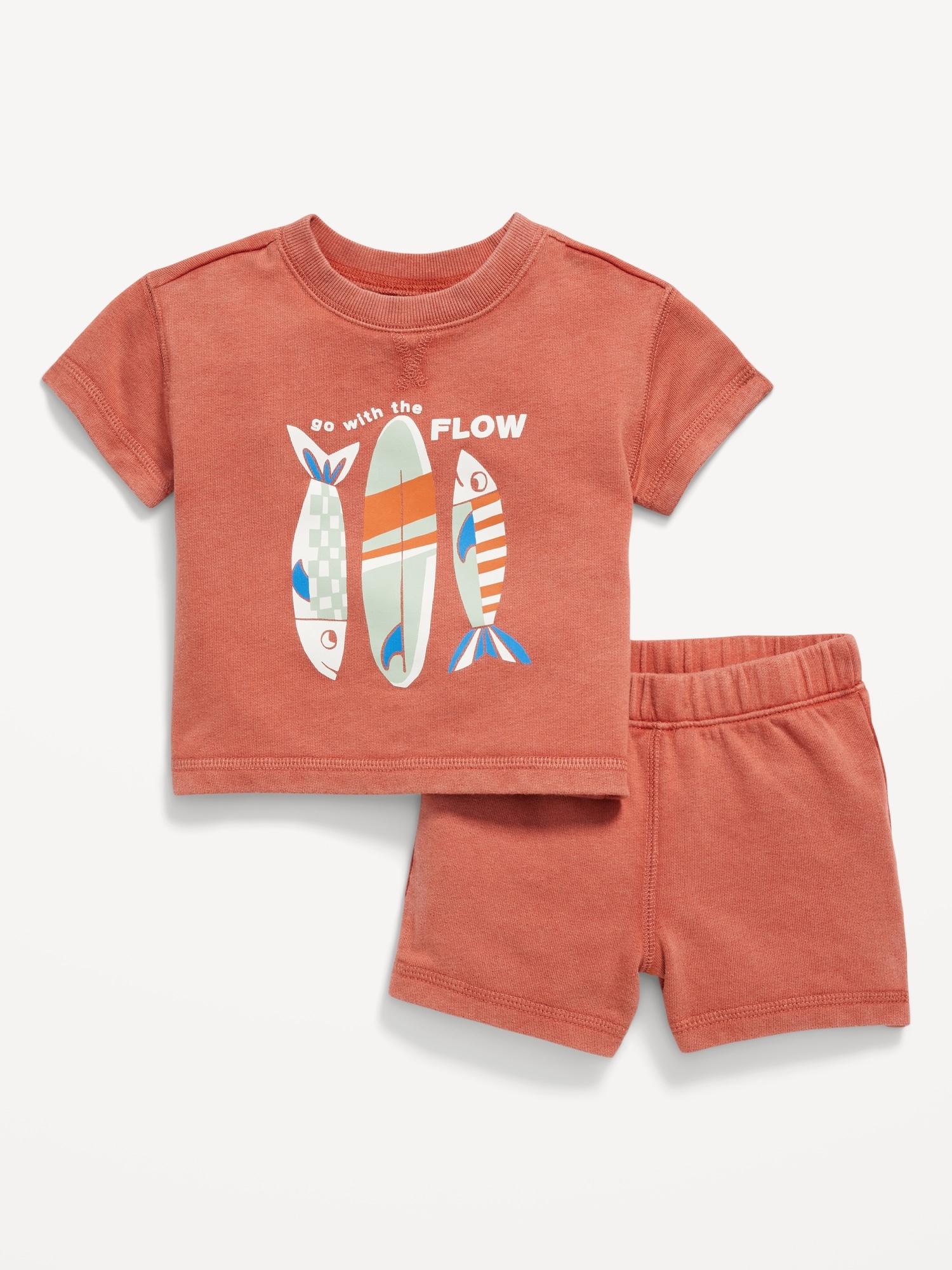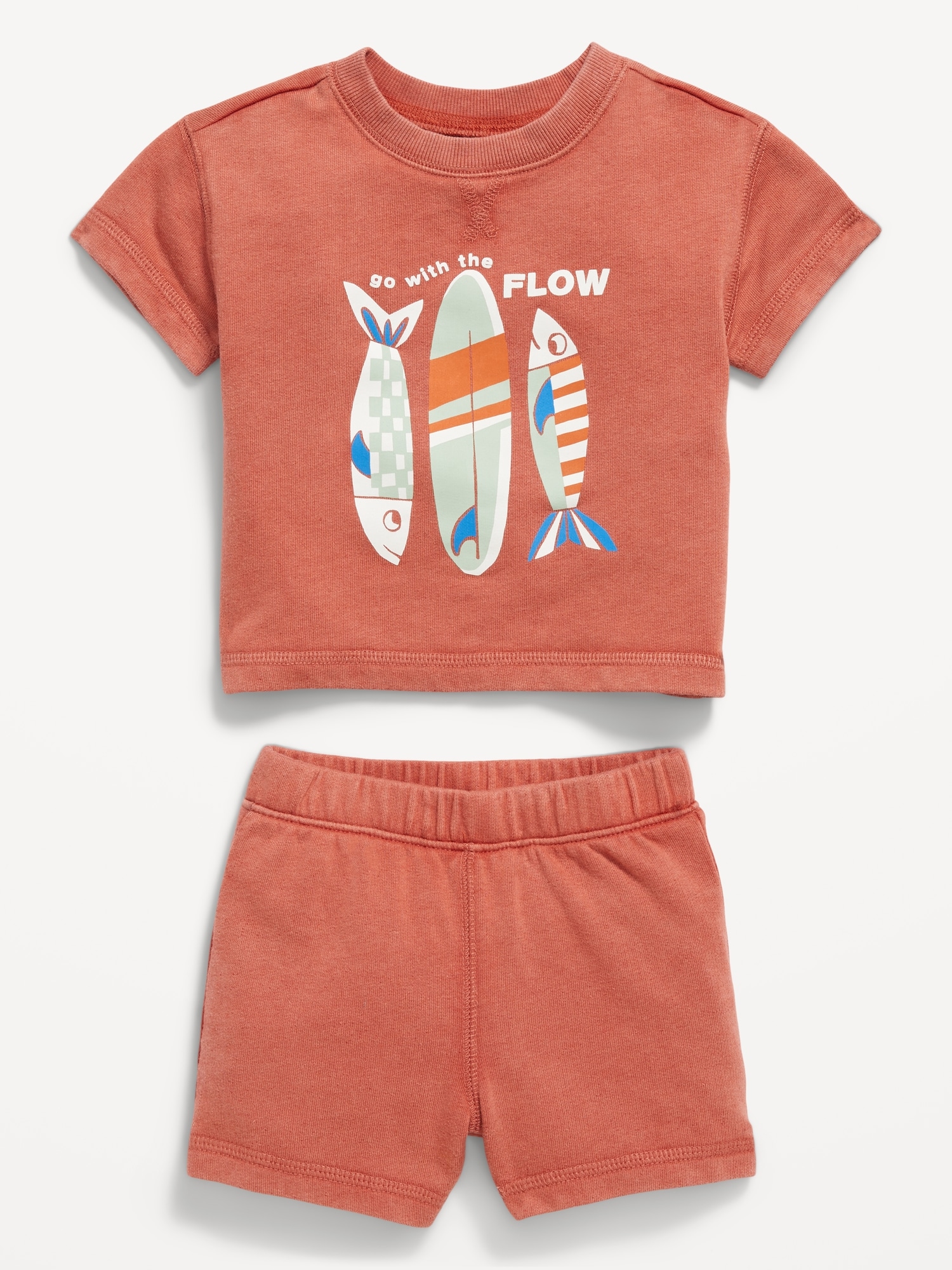 French-Terry Graphic Top and Shorts Set for Baby: crew neck, short sleeves, graphic at front, matching shorts, elasticized waistband, #761914