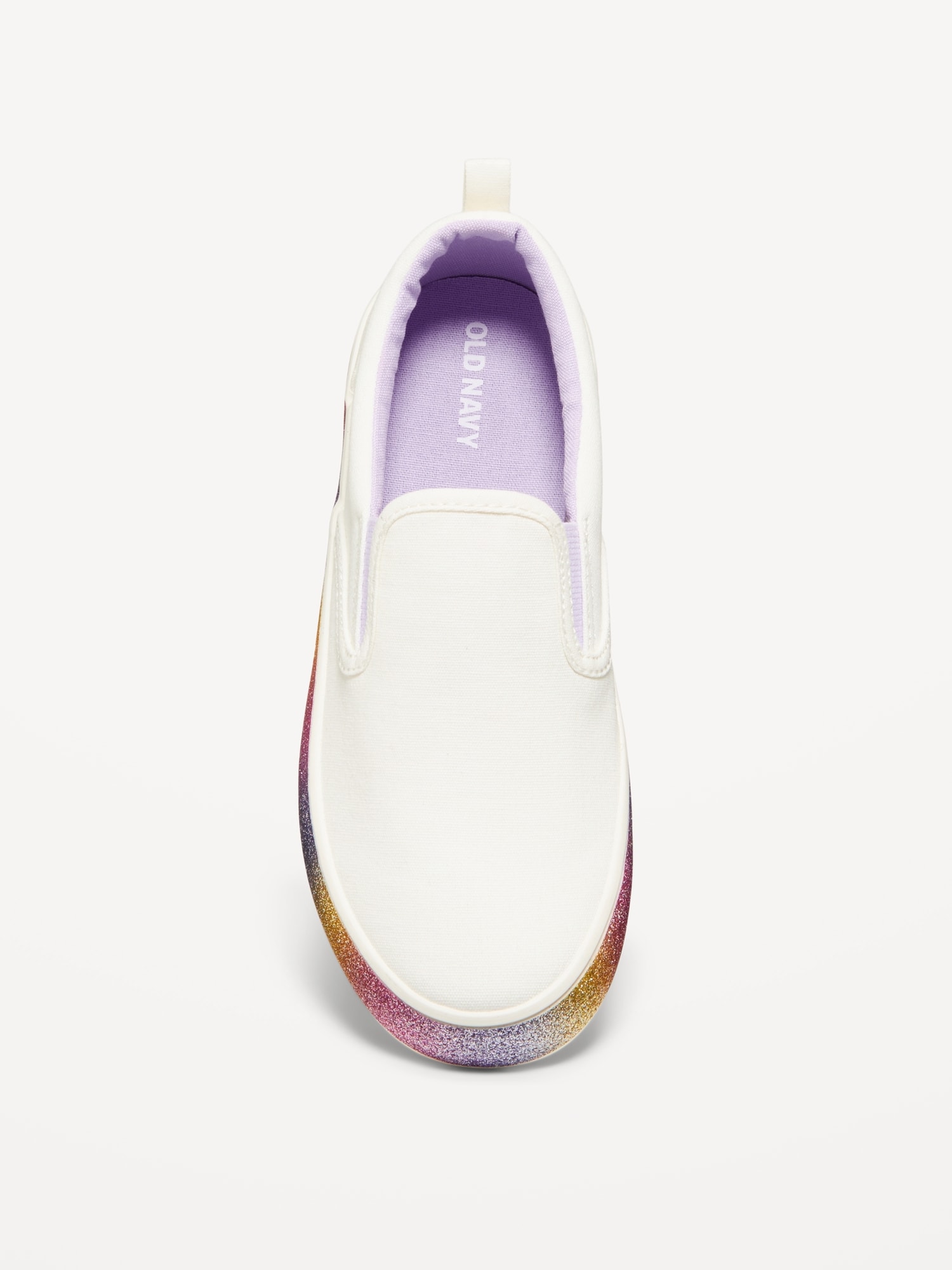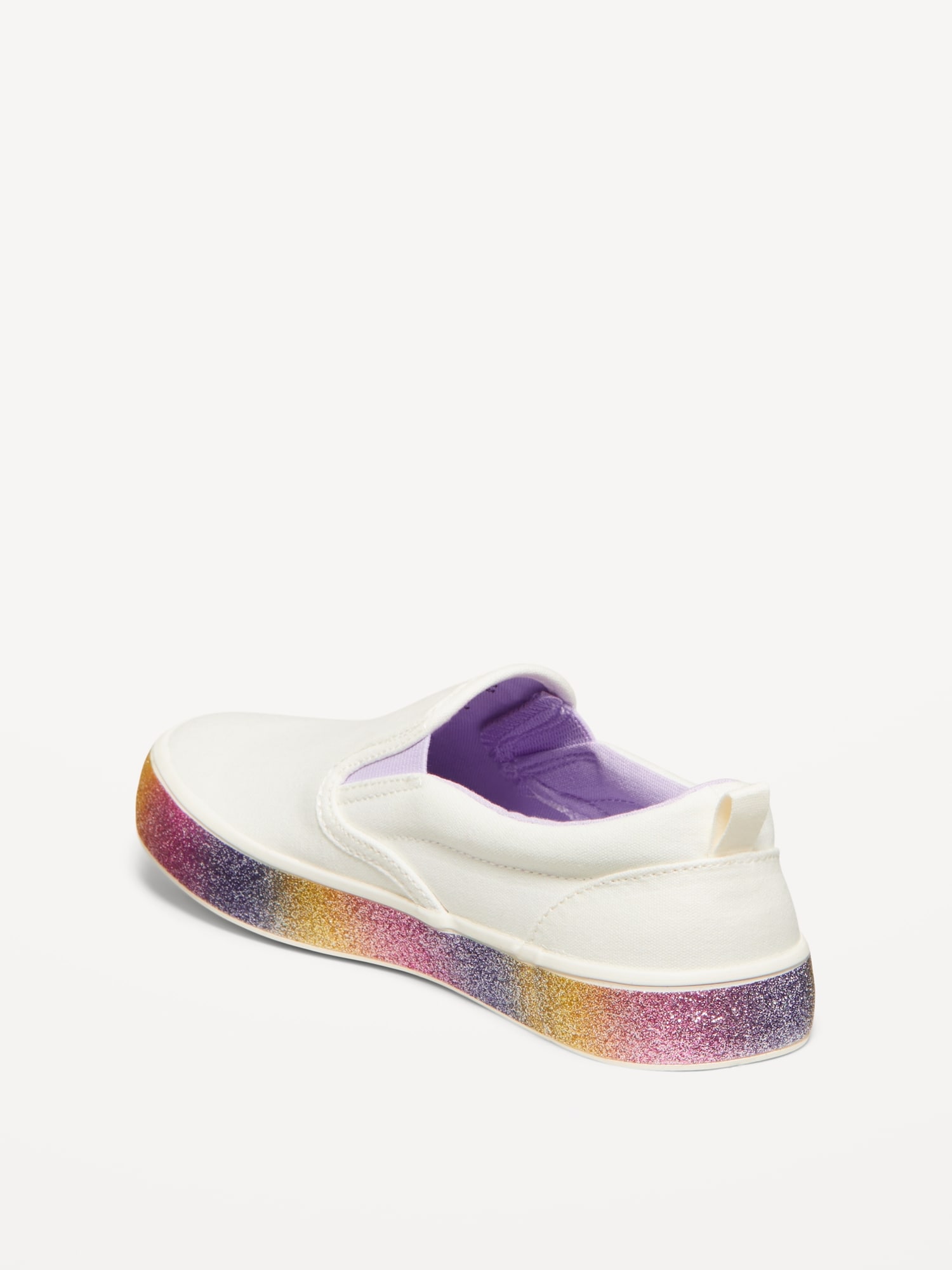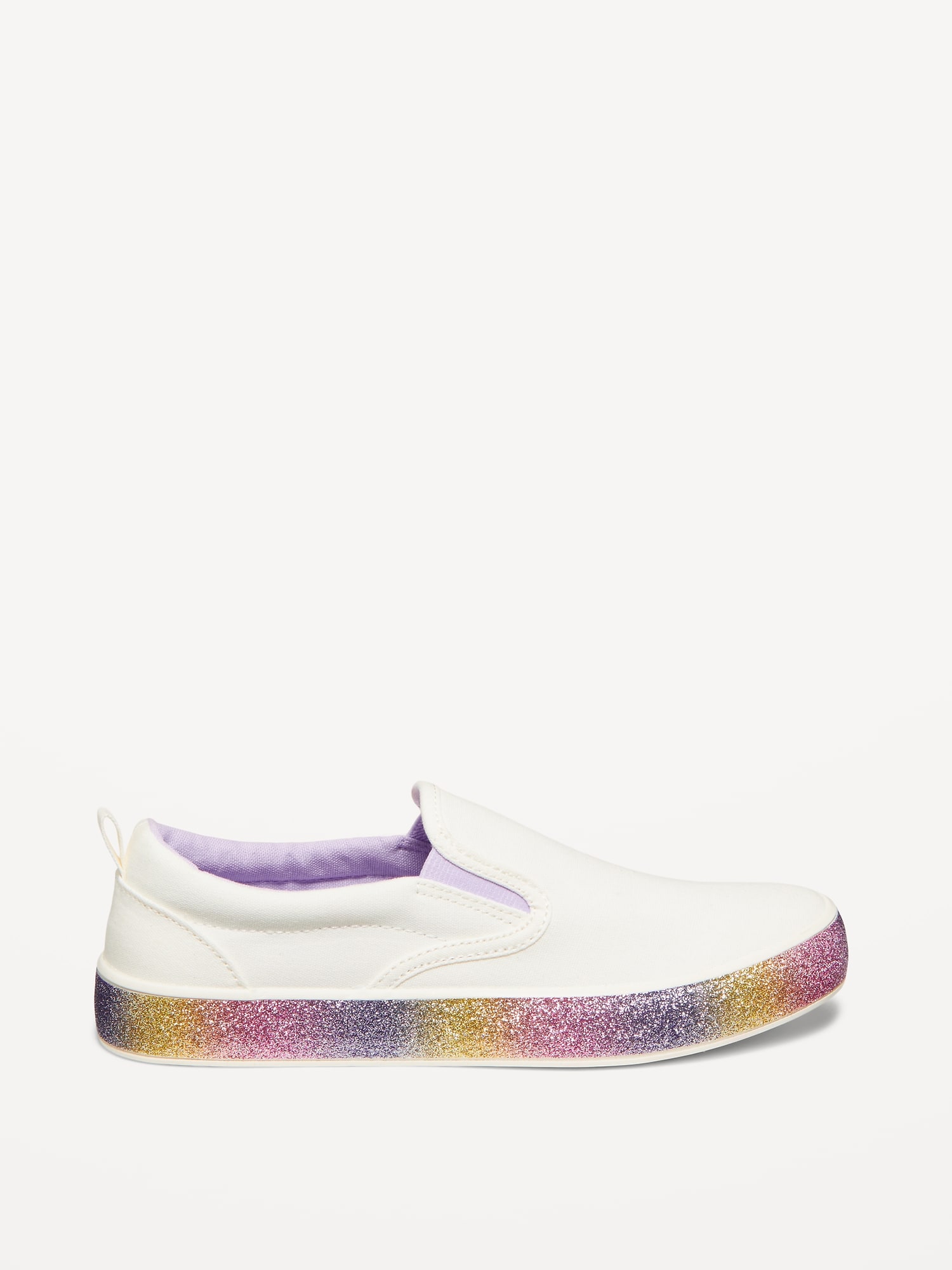 Glitter Canvas Slip-On Sneakers for Girls: webbed goring at sides, round toe, cushioned foot bed, thermoplastic rubber midsole, textured outsole, pull tab at heel, #508960