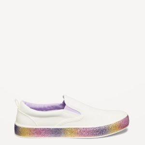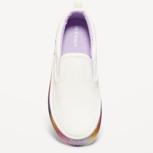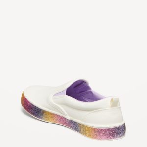 Glitter Canvas Slip-On Sneakers for Girls: webbed goring at sides, round toe, cushioned foot bed, thermoplastic rubber midsole, textured outsole, pull tab at heel, #508960