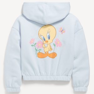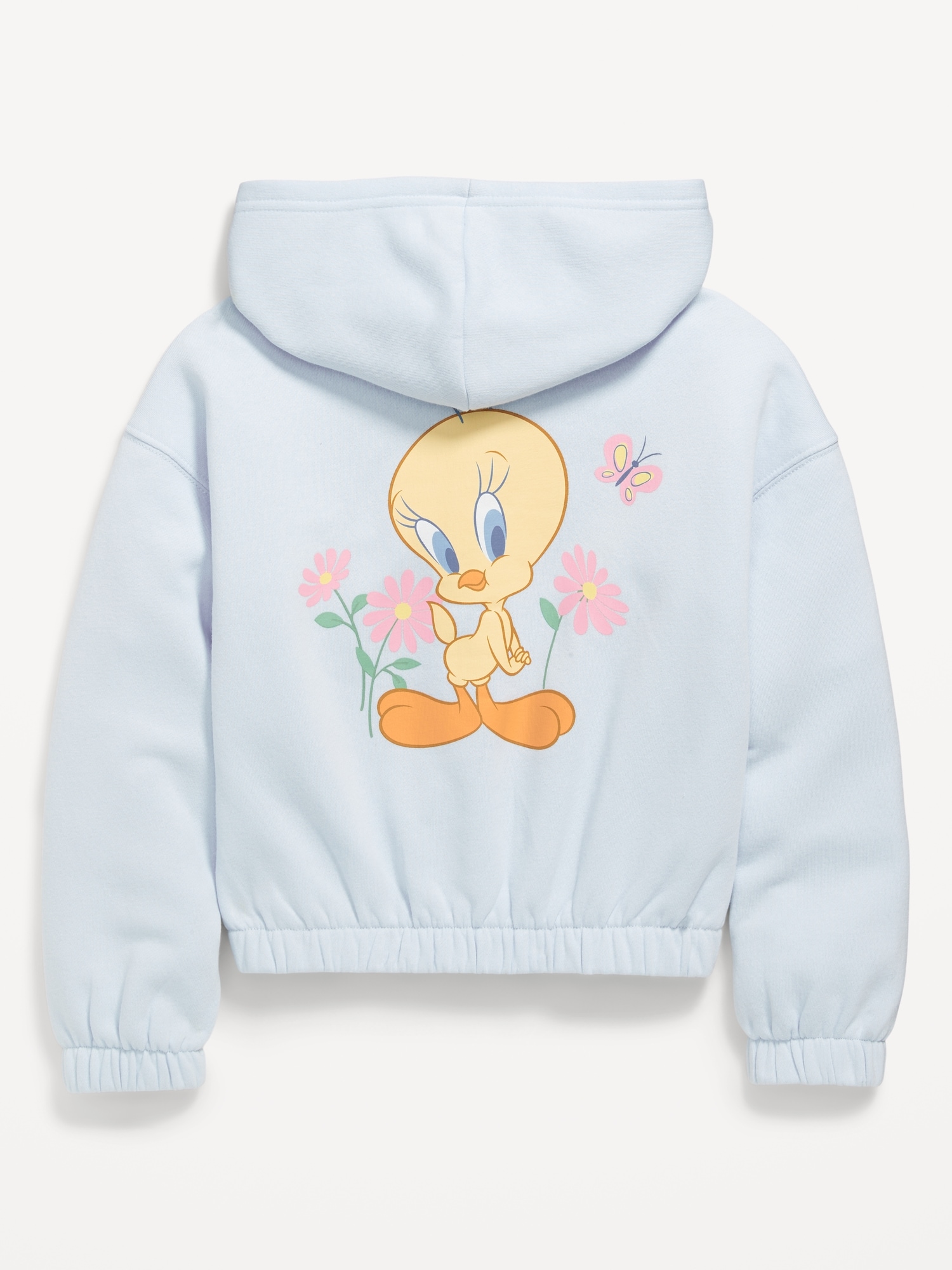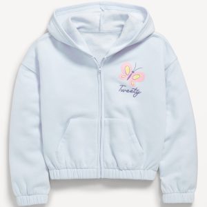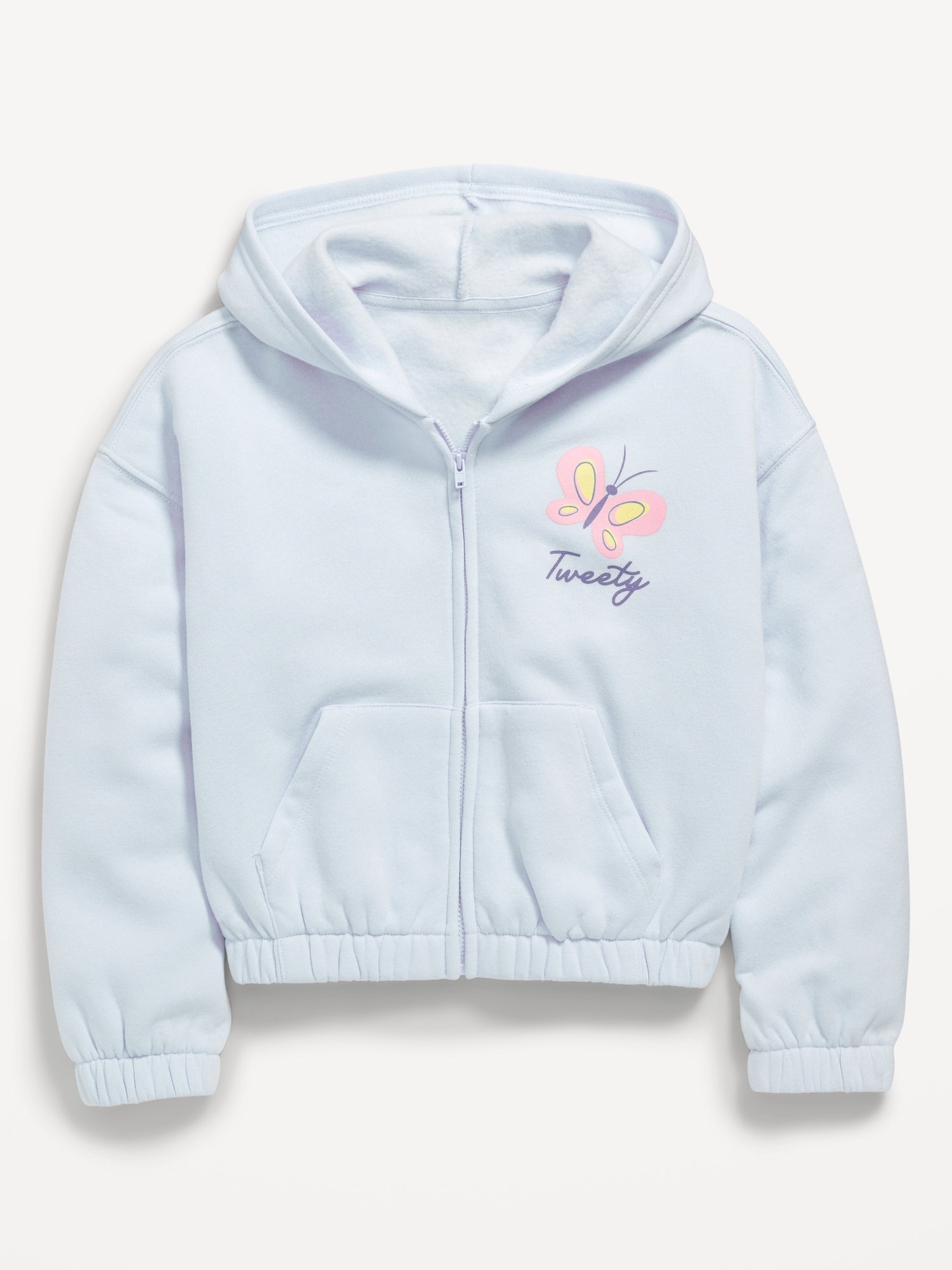 Graphic Fleece Zip-Front Hoodie for Girls: built-in hood, long sleeves, drop shoulders, hand-warming pockets, cinched hem, small-scale graphic at front, full-length zipper, #684266