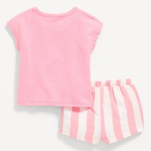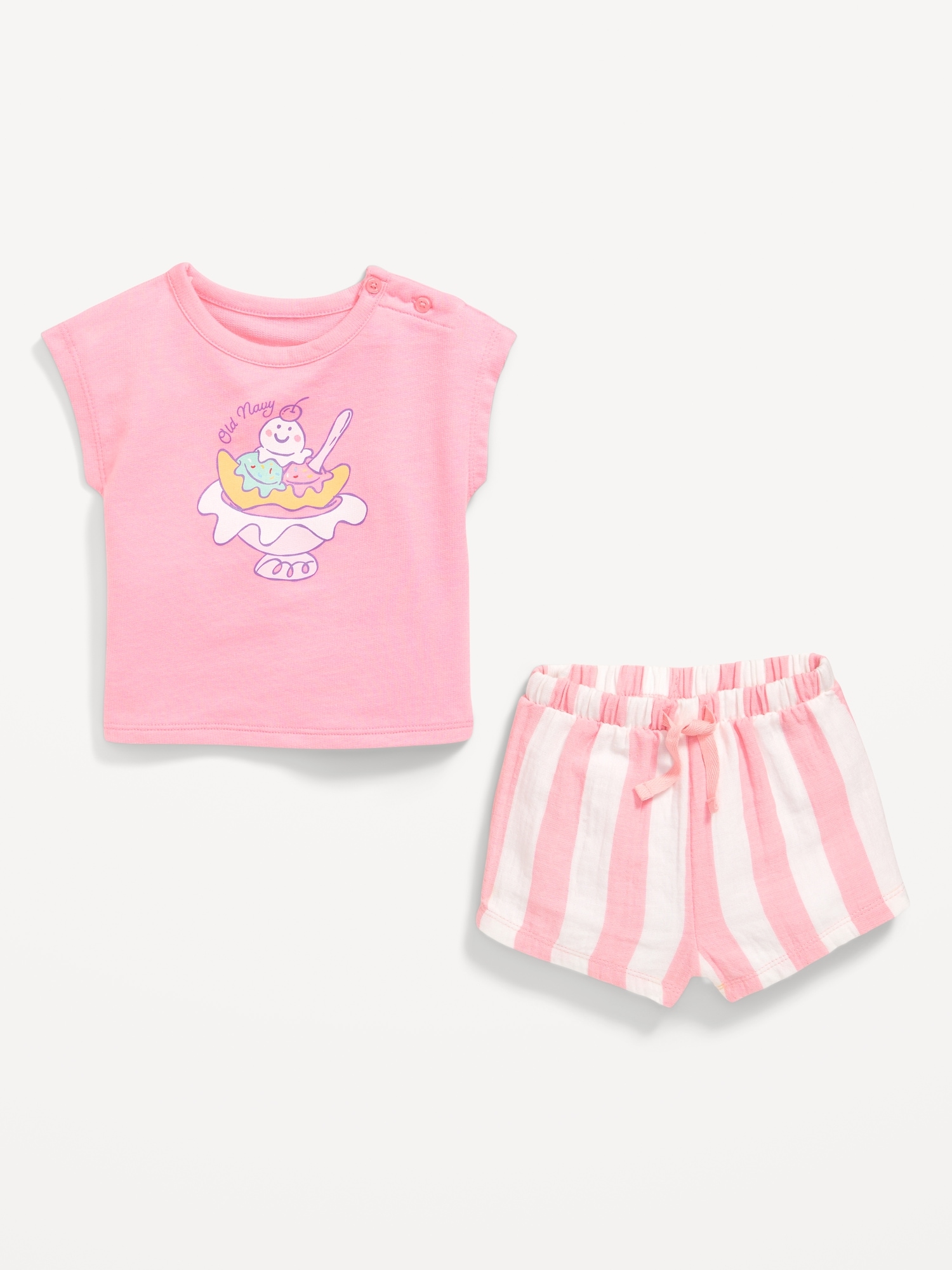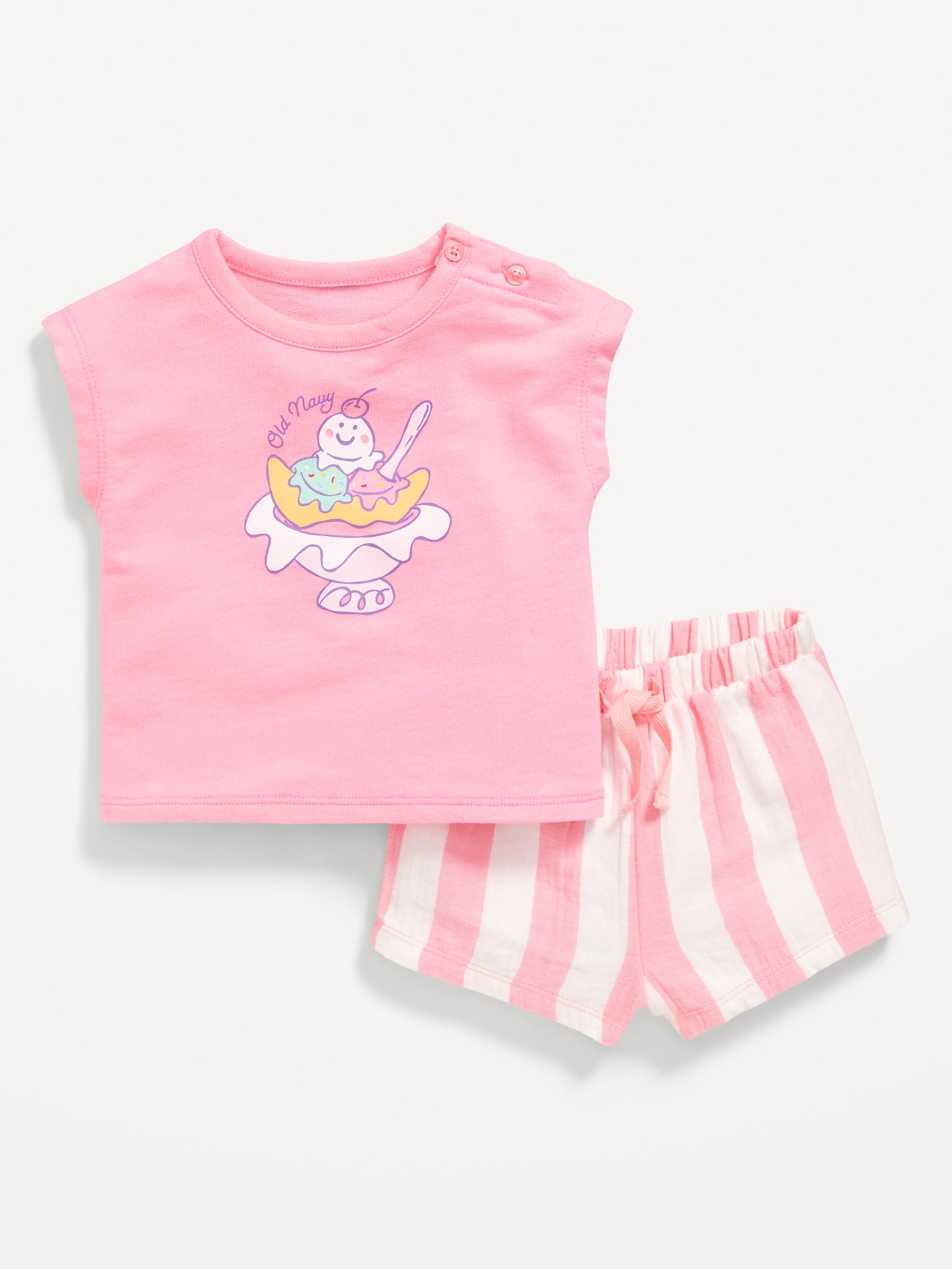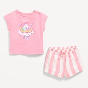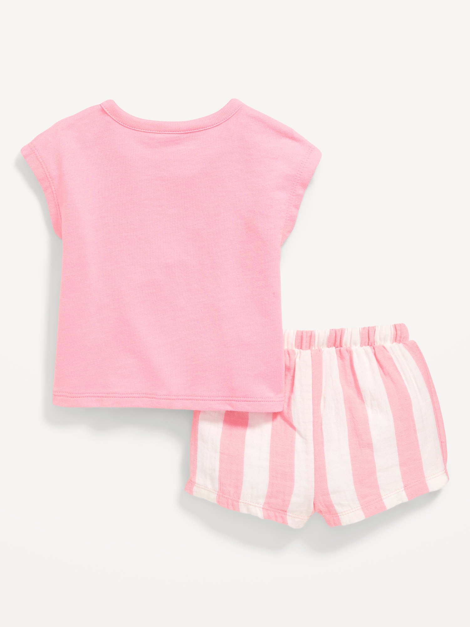 Graphic Top and Shorts Set for Baby: crew neck with buttons at shoulder, dolman sleeves, front graphic, functional elastic-drawstring waist shorts, available exclusively online and at old navy outlets, #766737