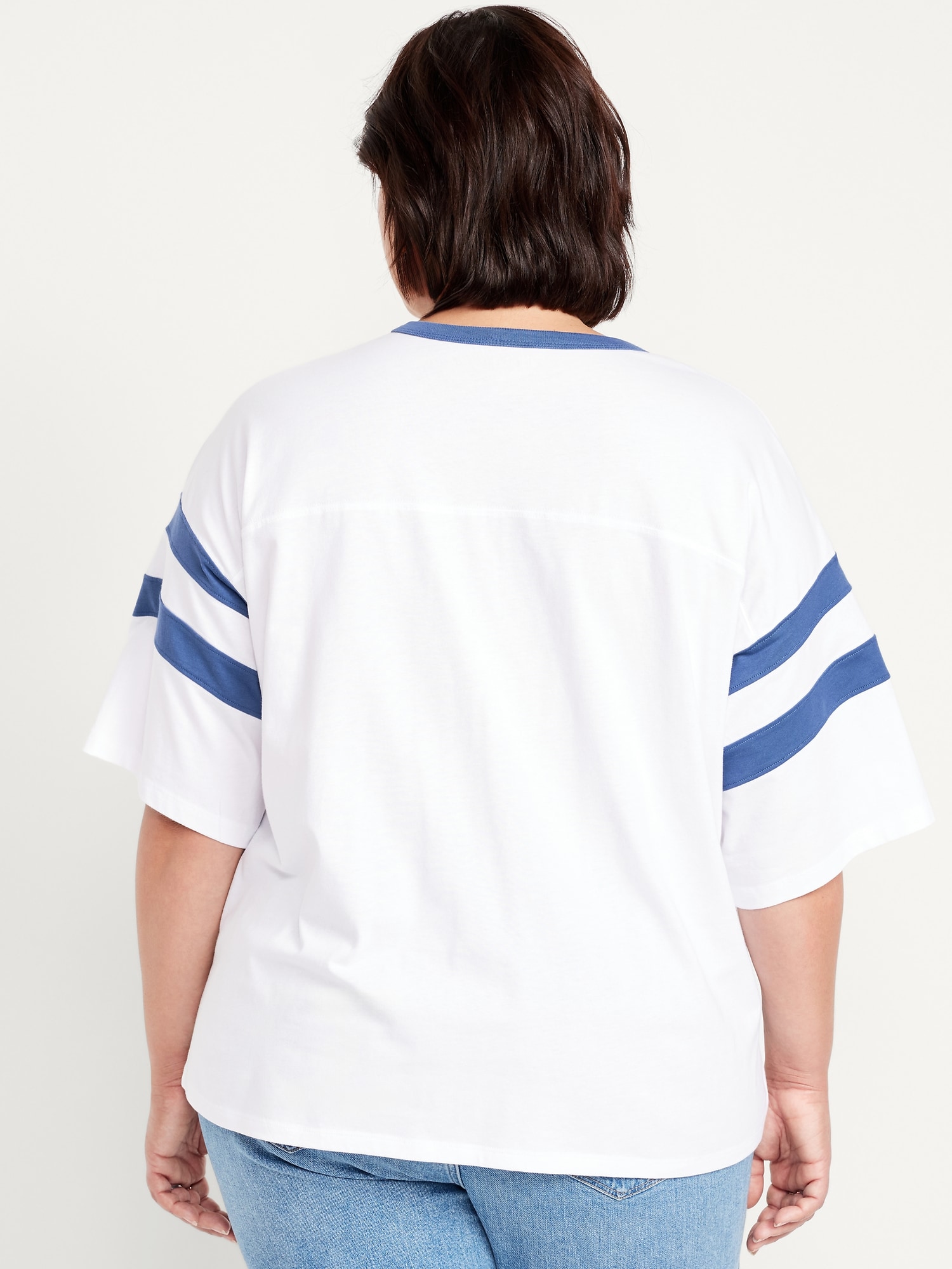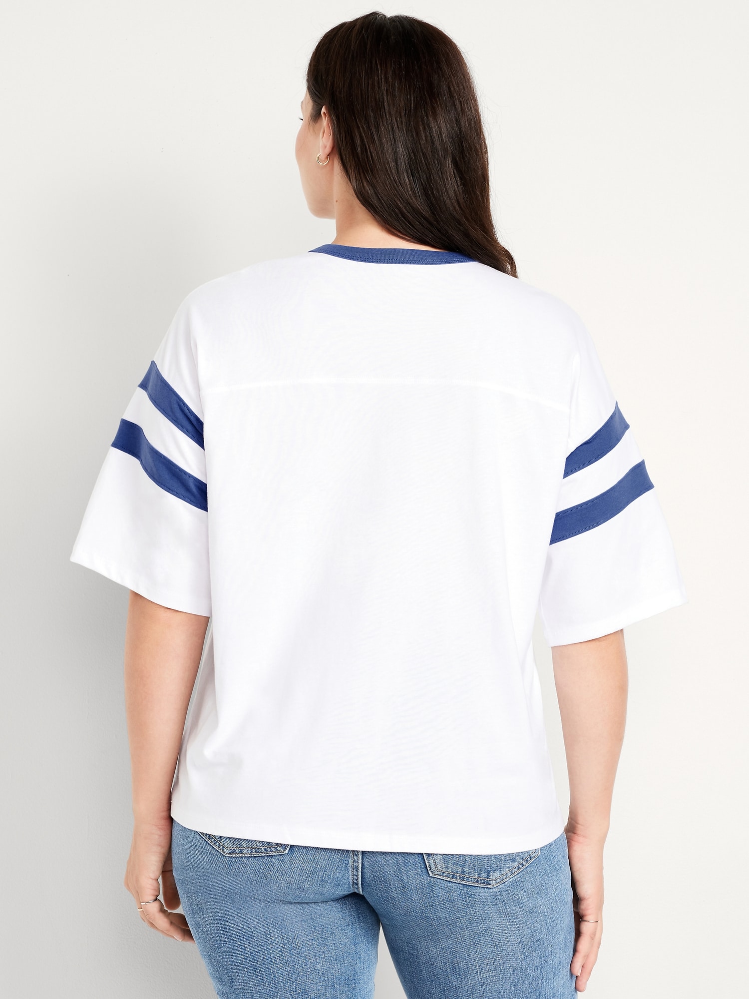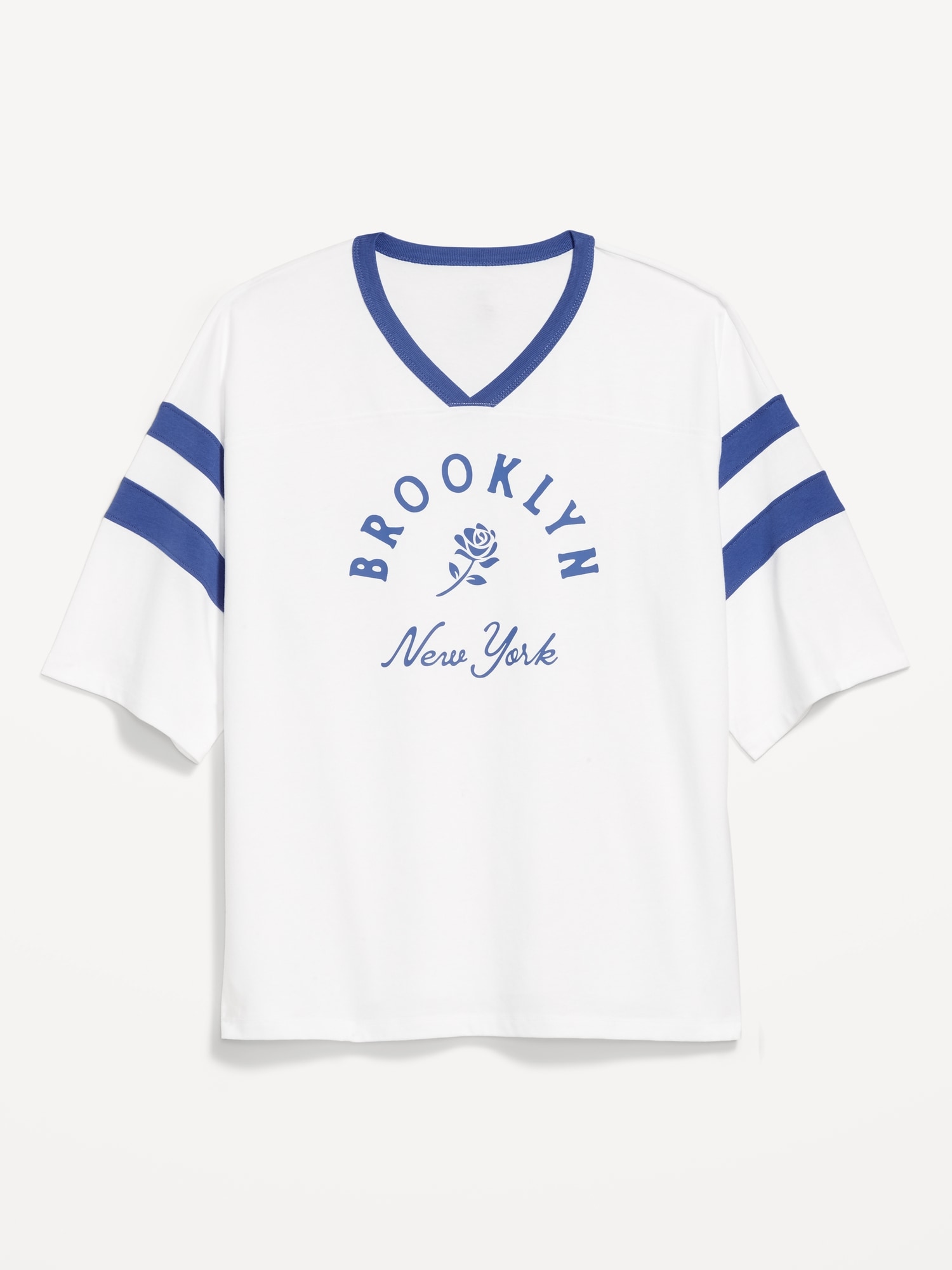 Heavyweight Football-Style Graphic T-Shirt: v-neck, short sleeves with contrasting stripes, seamed yoke, front graphic, #844567