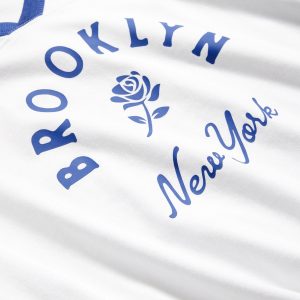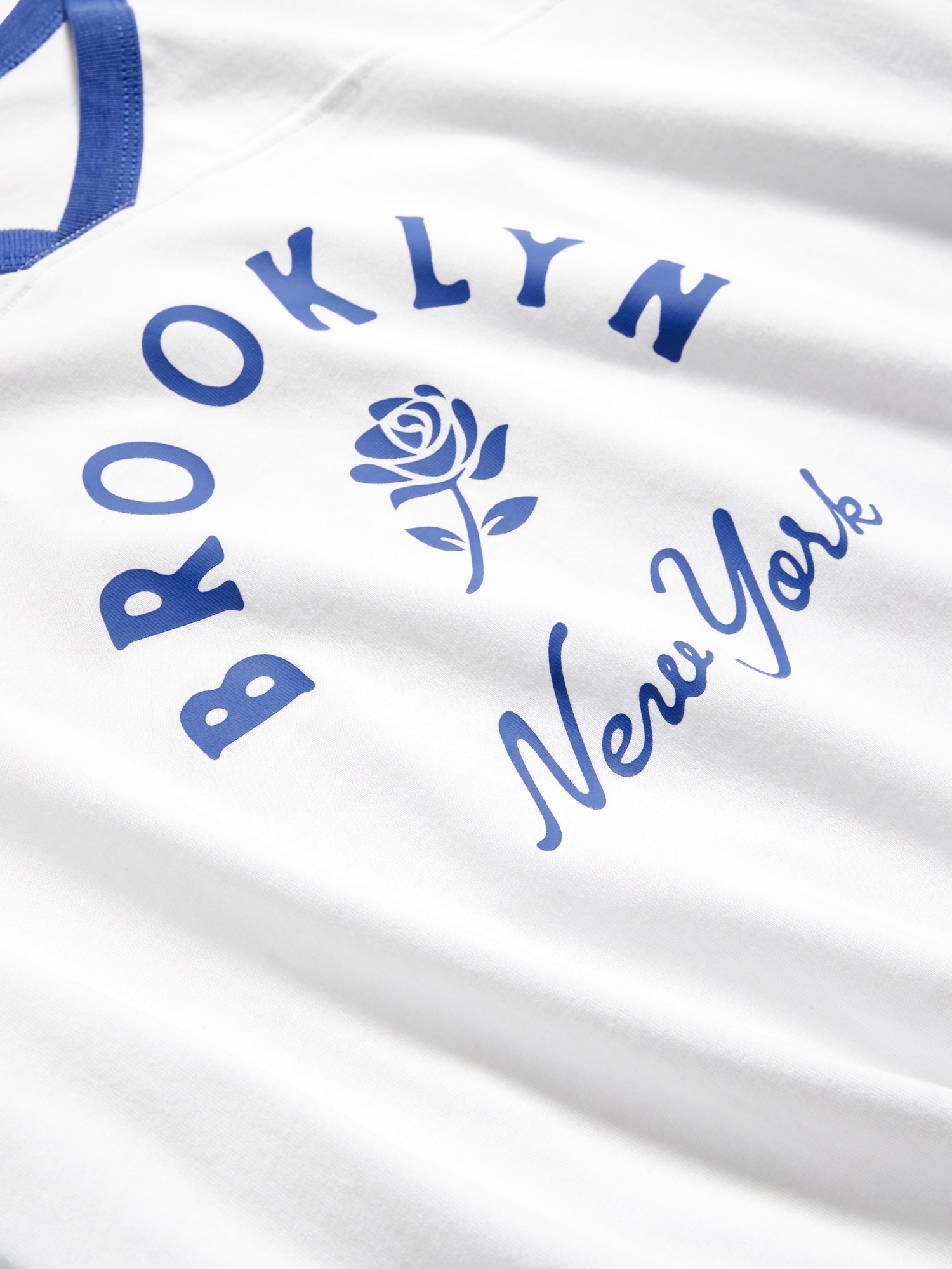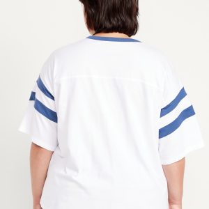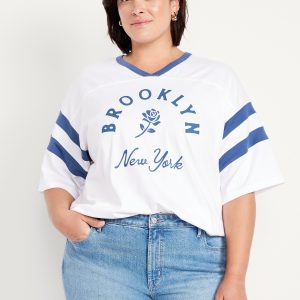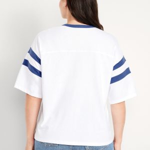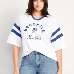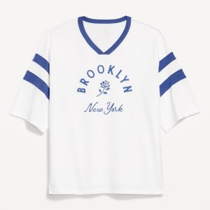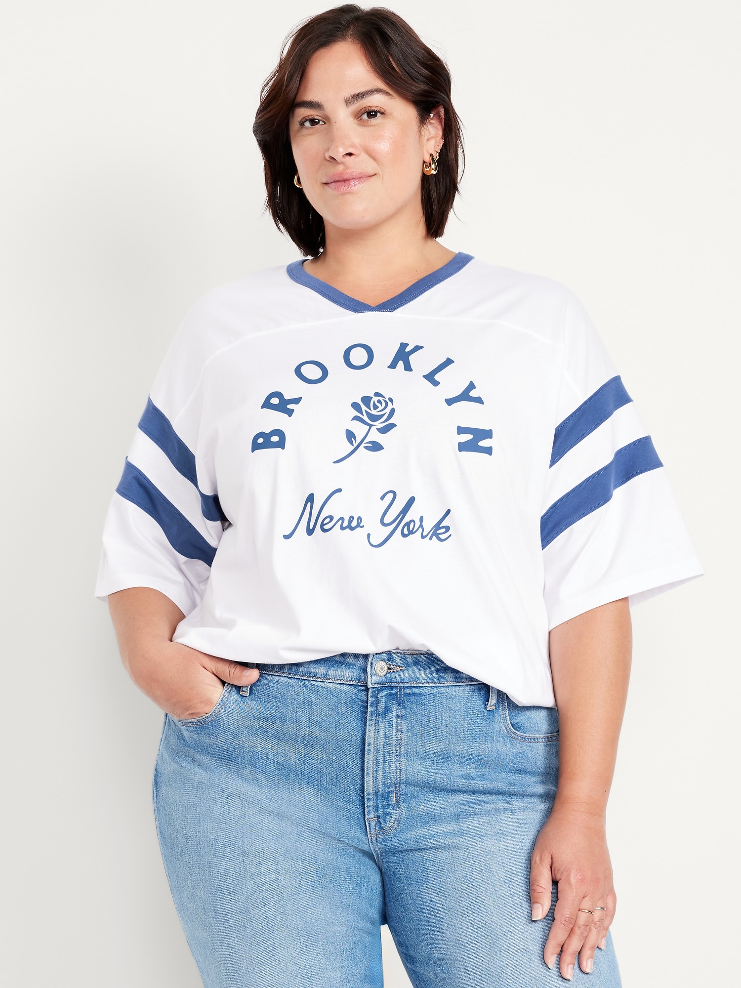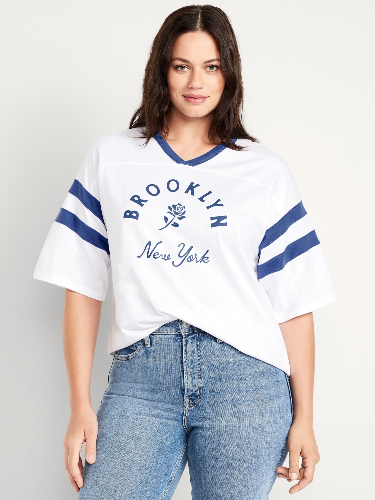 Heavyweight Football-Style Graphic T-Shirt: v-neck, short sleeves with contrasting stripes, seamed yoke, front graphic, #844567