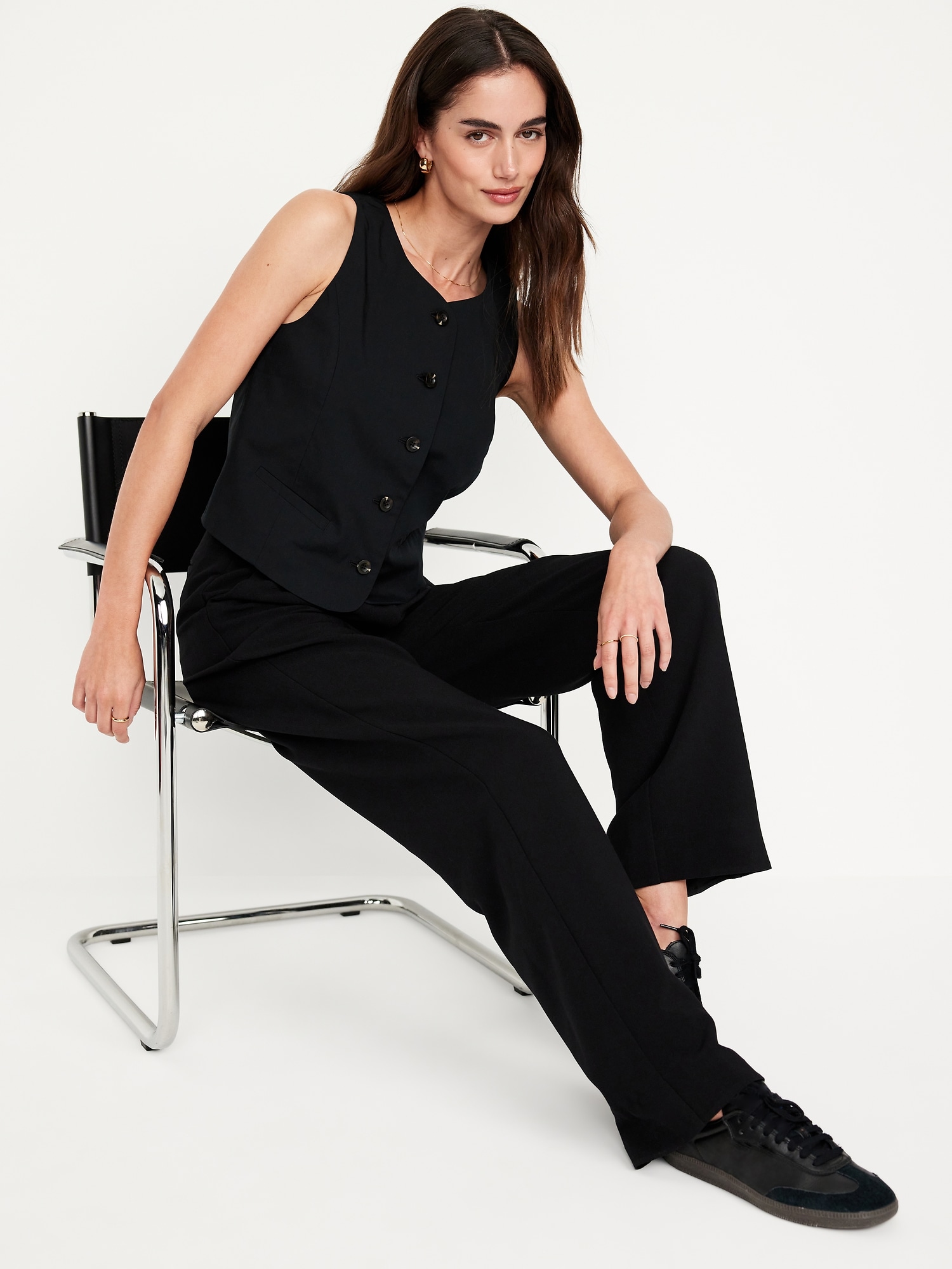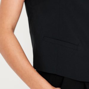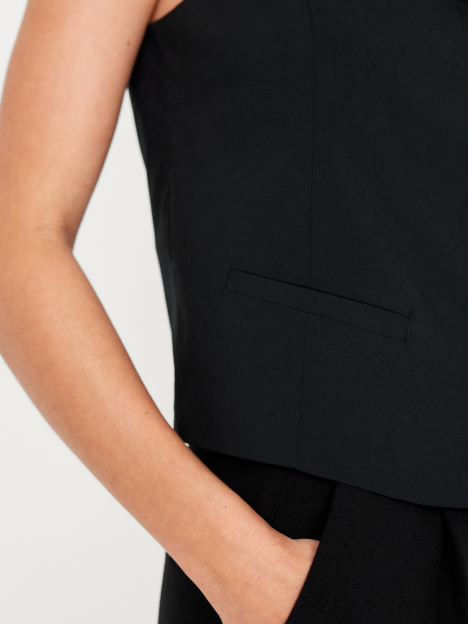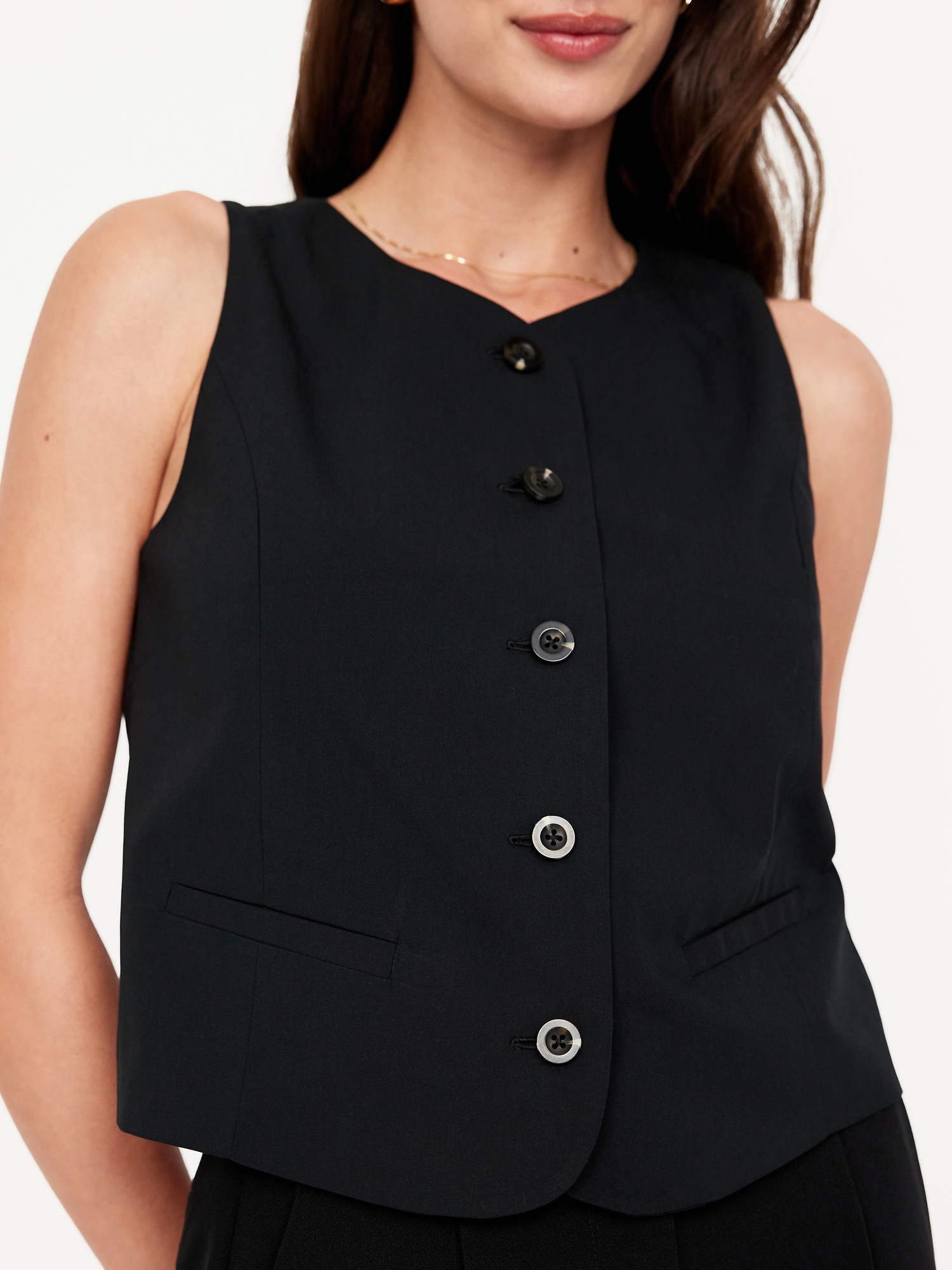 High-Neck Button-Down Vest: high neck, sleeveless, full-button front, welt pockets, princess seams, #693727