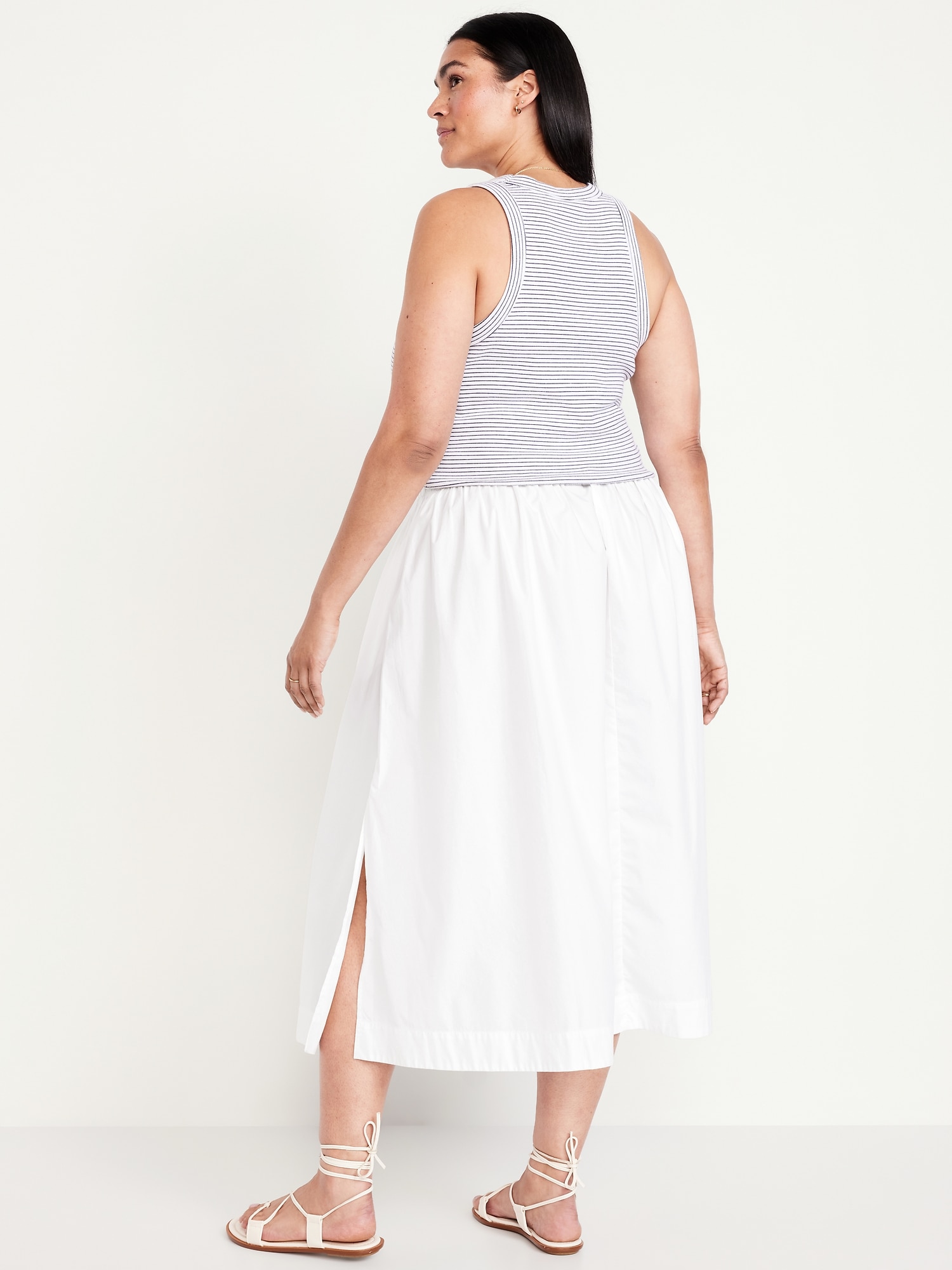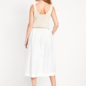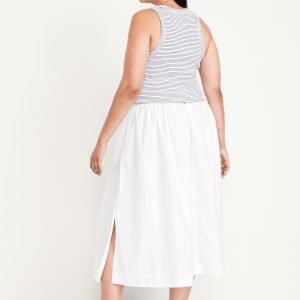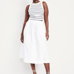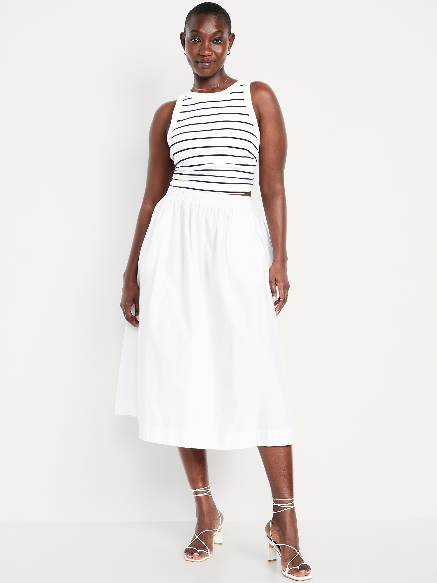 High-Waisted A-Line Midi Skirt: high elasticized waistband, side-seam pockets, striped print, #766934