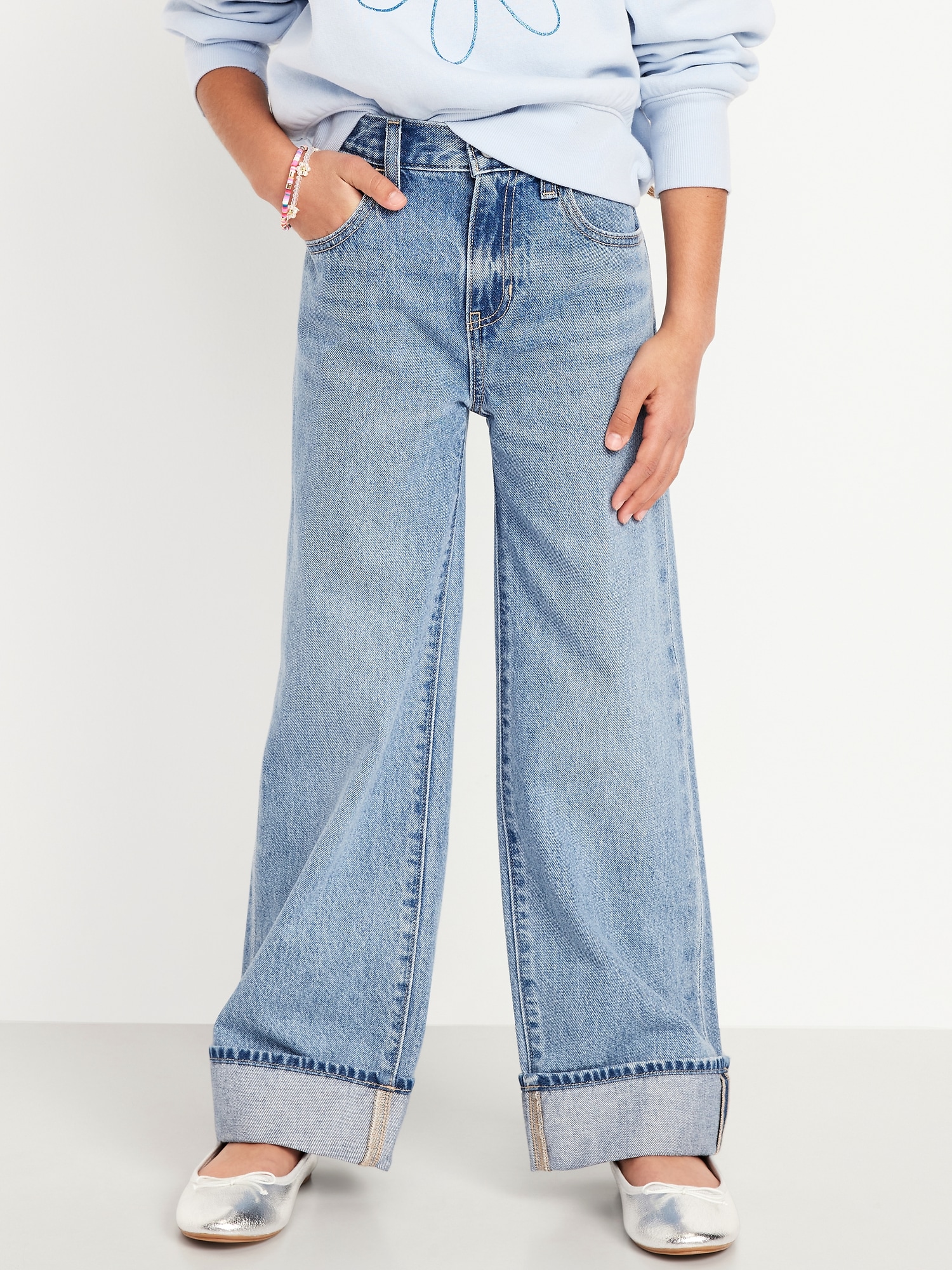High-Waisted Baggy Wide-Leg Jeans for Girls: interior adjustable waistband, snap button closure (sizes 5-8), regular button closure (sizes 10-20), zip fly, scoop pockets and coin pocket, patch pockets at back, wide leg opening, rolled cuff, #767083