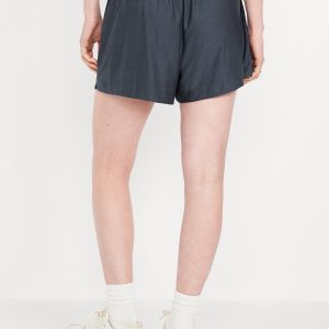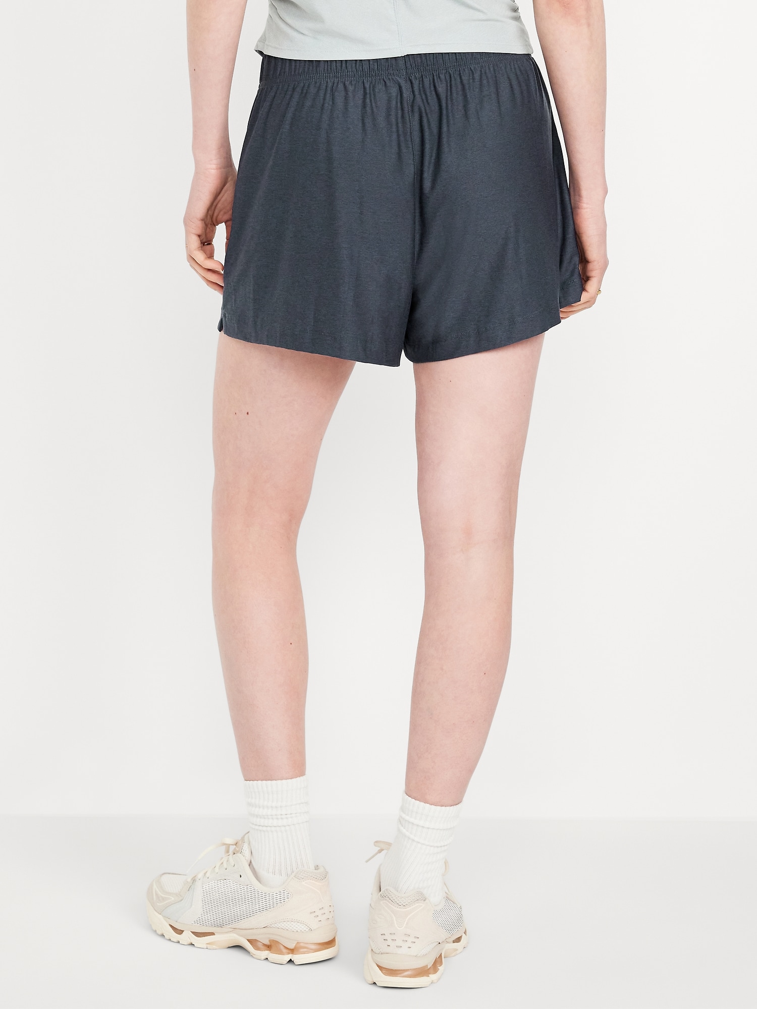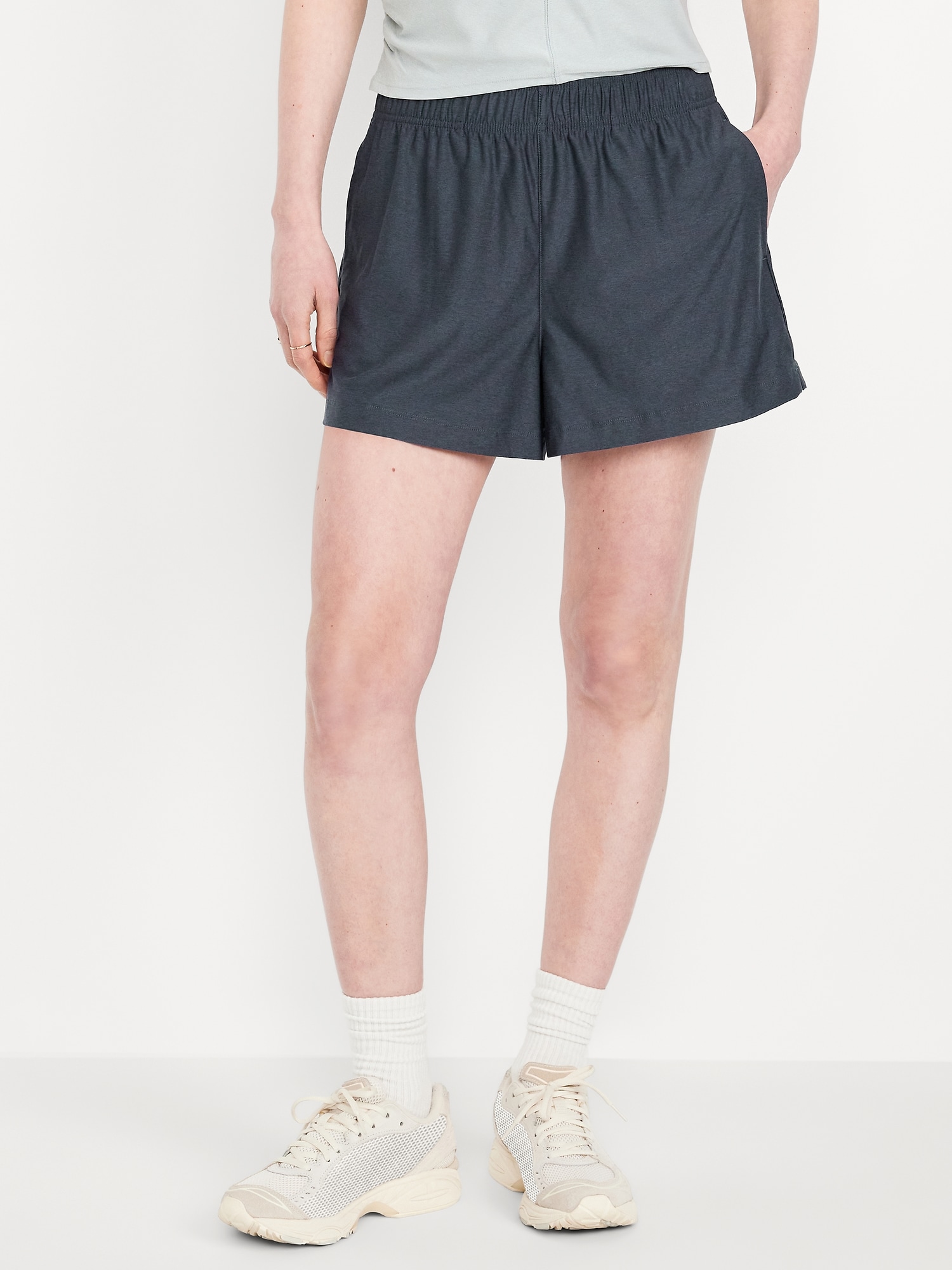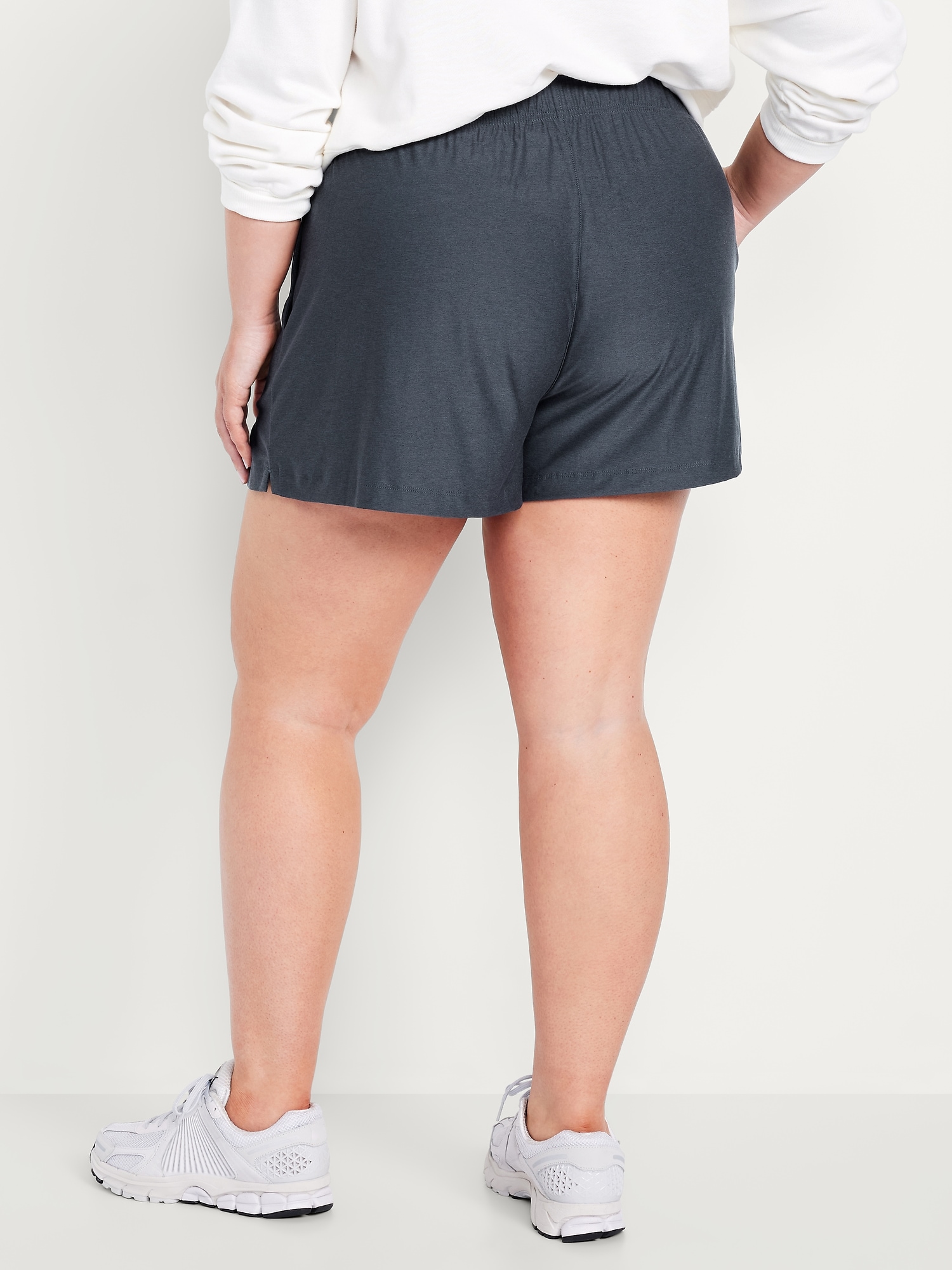 High-Waisted CloudMotion Shorts — 3-inch inseam: The new Cloud94 Soft. Versatile, sweat-wicking and soft as a literal cloud.elastic waistband, on-seam side pockets, notched hem, go-dry wicks moisture, breathable, #748687