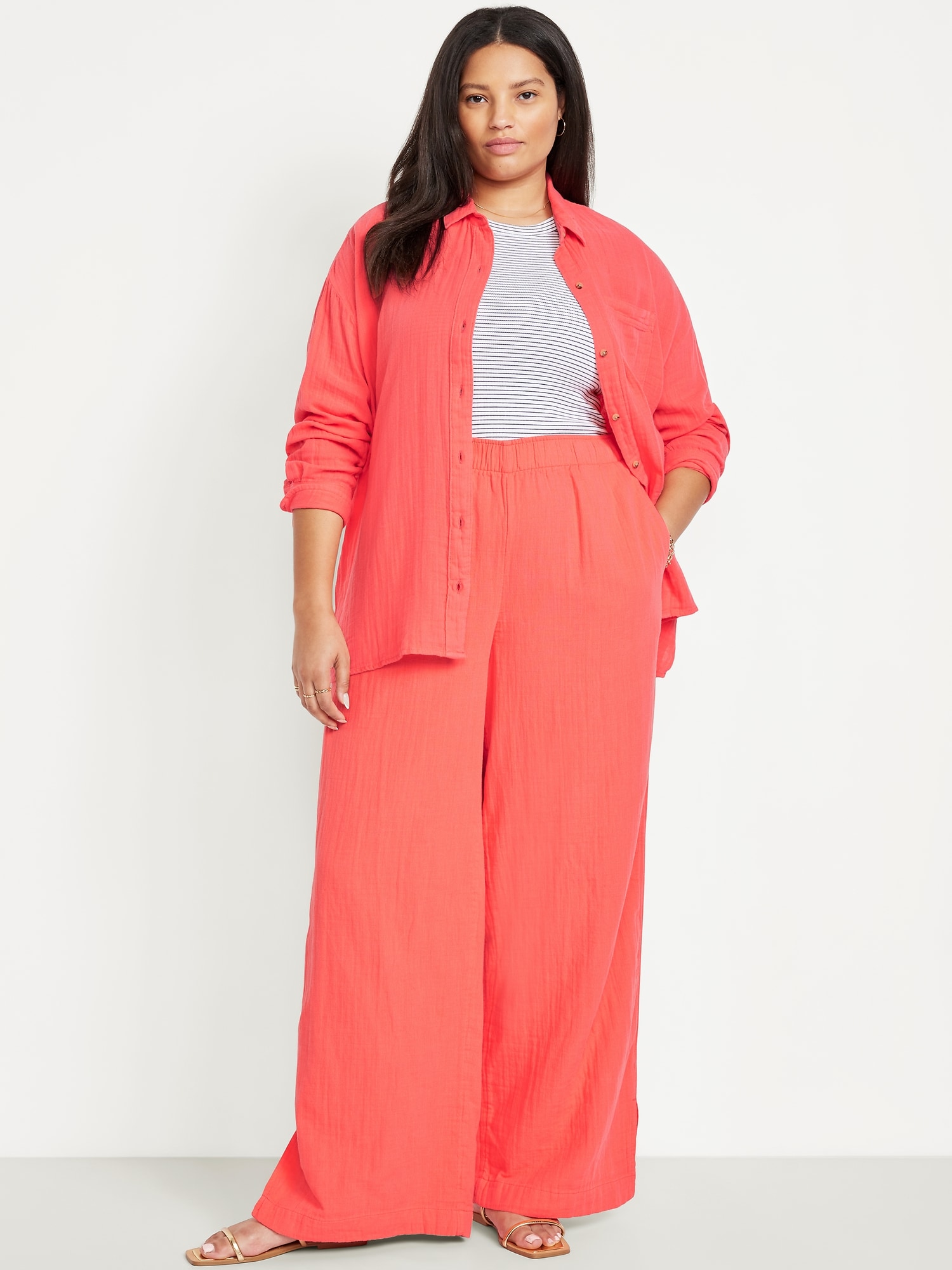 High-Waisted Crinkle Gauze Super Wide-Leg Pants: A light, rippled fabric that’s begging to be beachside.comfort-elastic high pull-on waistband, on-seam pockets, super wide leg, striped print, #683359