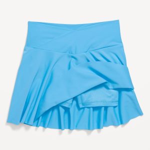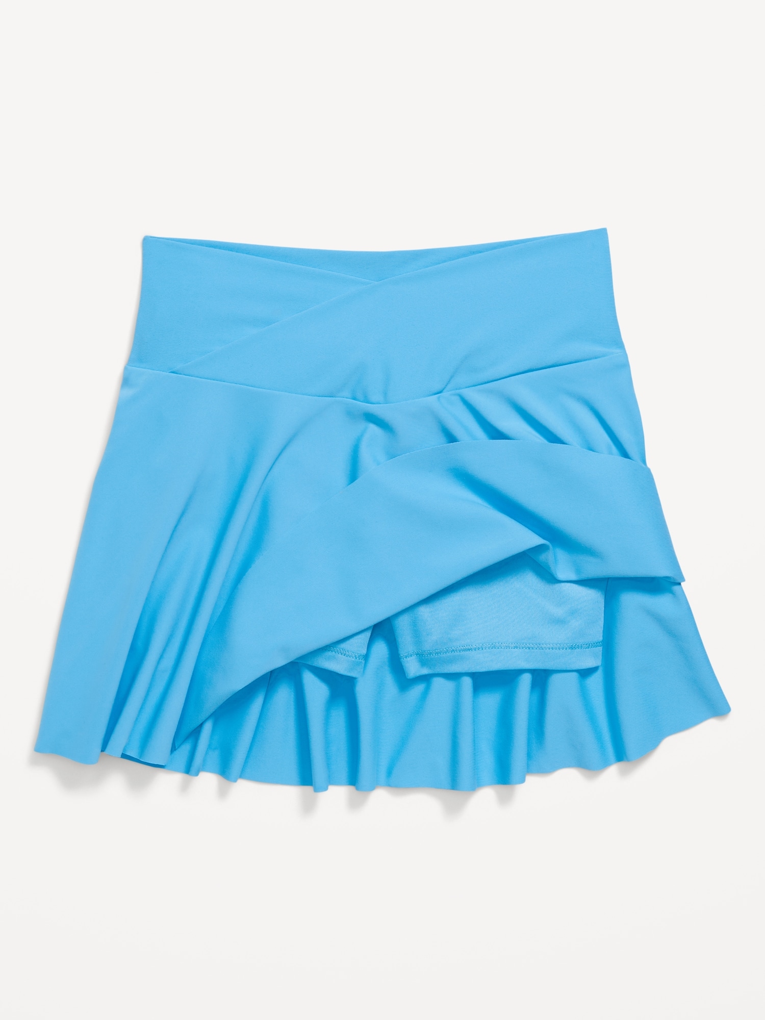 High-Waisted Crossover PowerSoft Skort for Girls: built-in biker shorts, high-rise, crossover elasticized waistband, mini-length skirt, side pocket on shorts, easy pull-on style, #696570