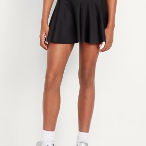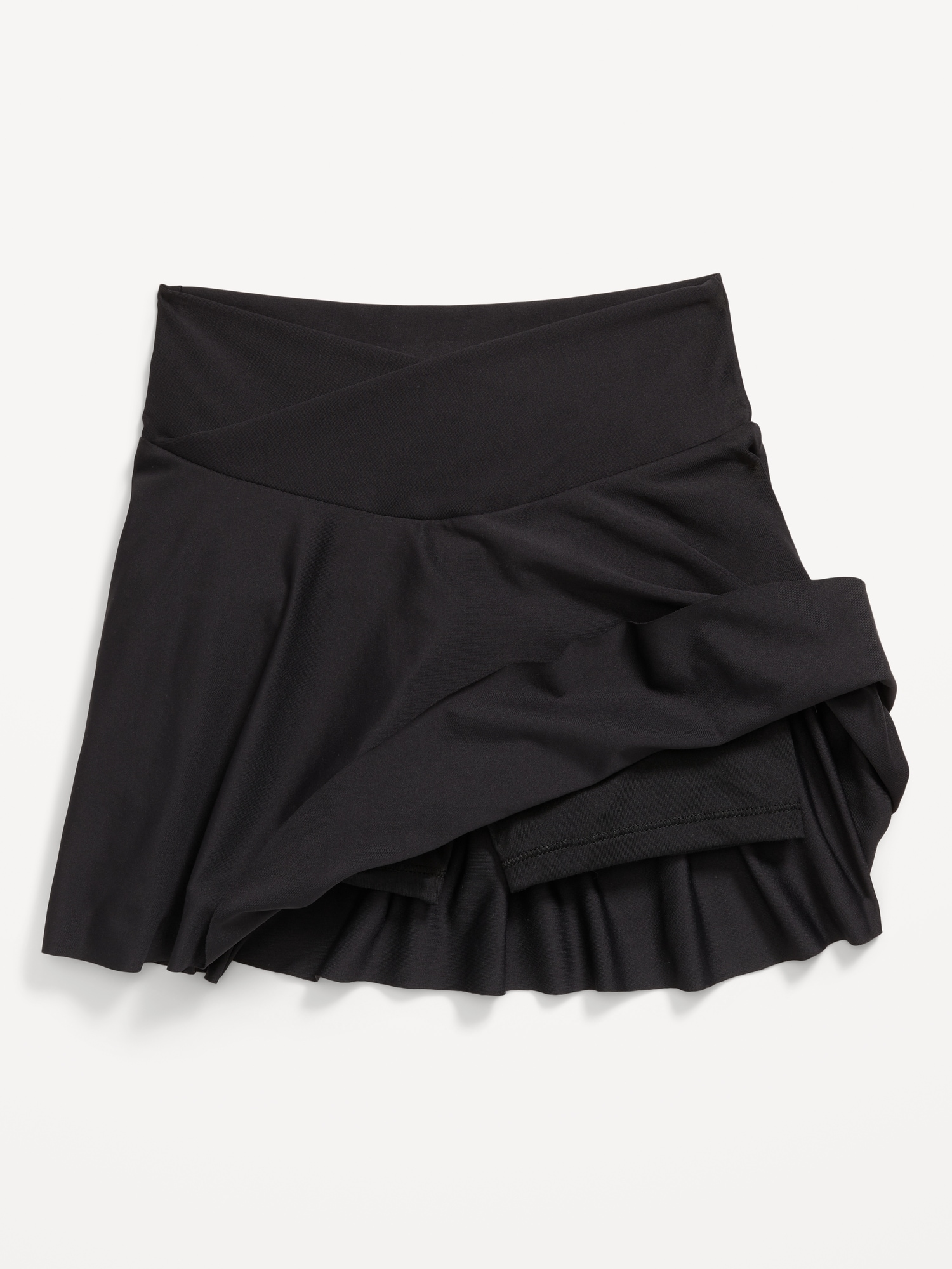 High-Waisted Crossover PowerSoft Skort for Girls: built-in biker shorts, high-rise, crossover elasticized waistband, mini-length skirt, side pocket on shorts, easy pull-on style, #696570