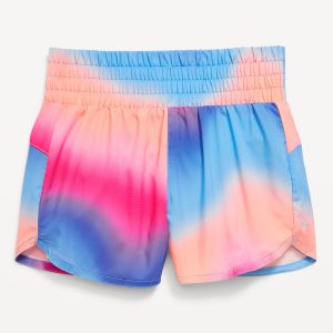 High-Waisted Dolphin-Hem Run Shorts for Girls: elasticized waistband, seamed back yoke, integrated built-in brief liner, vented dolphin hem, light-reflecting old navy active logo at left hem, #696568
