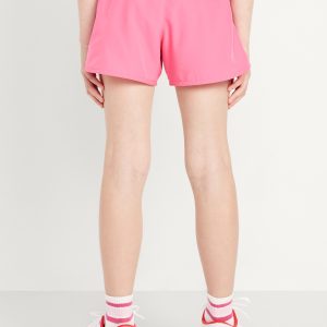 High-Waisted Dolphin-Hem Run Shorts for Girls: elasticized waistband, seamed back yoke, integrated built-in brief liner, vented dolphin hem, light-reflecting old navy active logo at left hem, #696568
