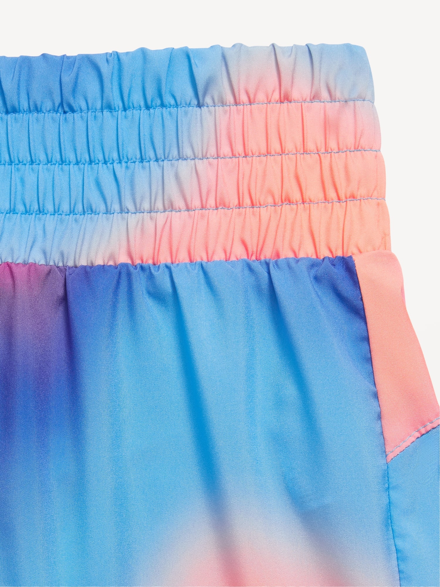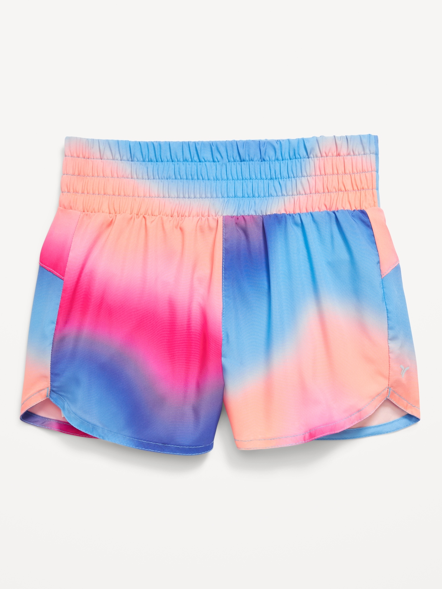 High-Waisted Dolphin-Hem Run Shorts for Girls: elasticized waistband, seamed back yoke, integrated built-in brief liner, vented dolphin hem, light-reflecting old navy active logo at left hem, #696568