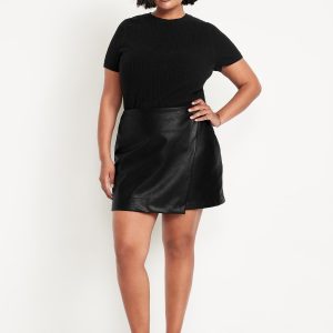 High-Waisted Faux-Leather Mini Skirt: wrap front, left side zipper, darted back, plaid print, #804477