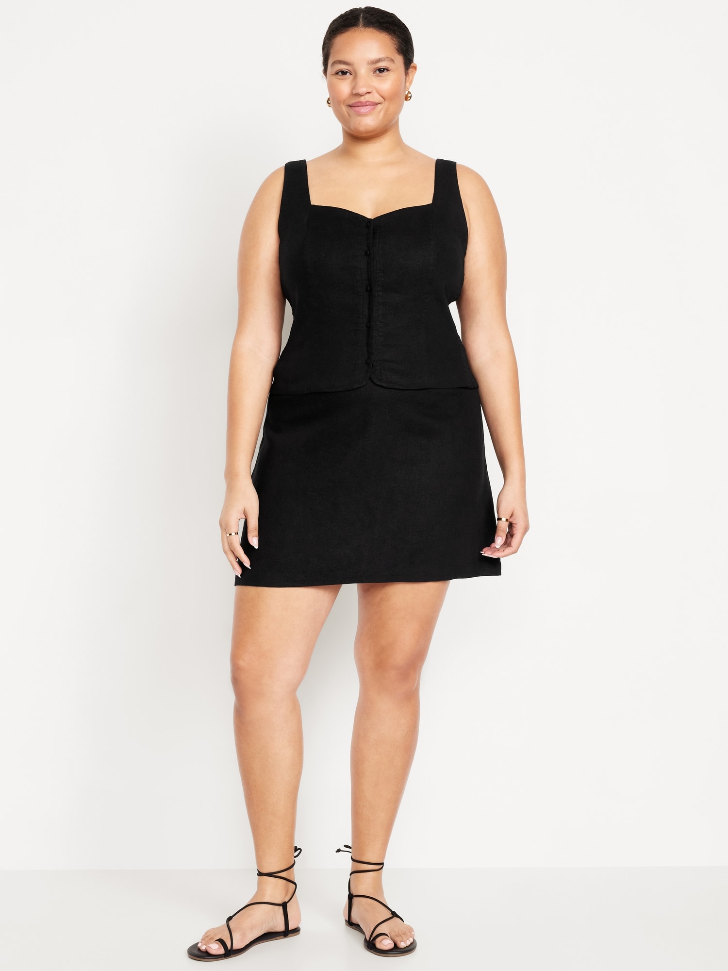 High-Waisted Linen-Blend Mini Skirt: elasticized back waist, hidden left seam zipper, back right welt pocket, pull-on style, vertical striped print, #705375