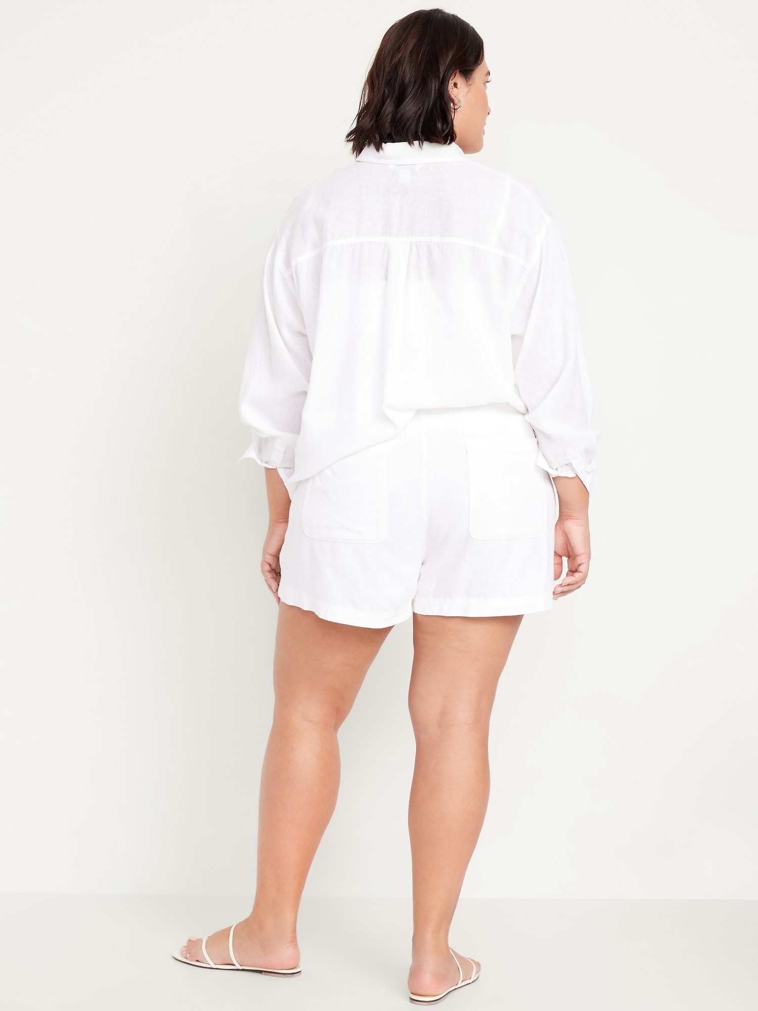 High-Waisted Linen-Blend Pull-On Shorts — 3.5-inch inseam: comfort elastic waistband, on-seam hip pockets, back patch pockets, easy pull-on style, #693453