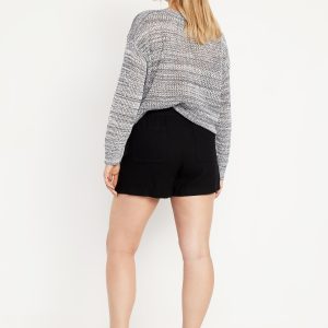 High-Waisted Linen-Blend Shorts — 3.5-inch inseam: comfort elastic waistband, on-seam hip pockets, back patch pockets, easy pull-on style, #693453