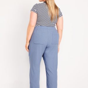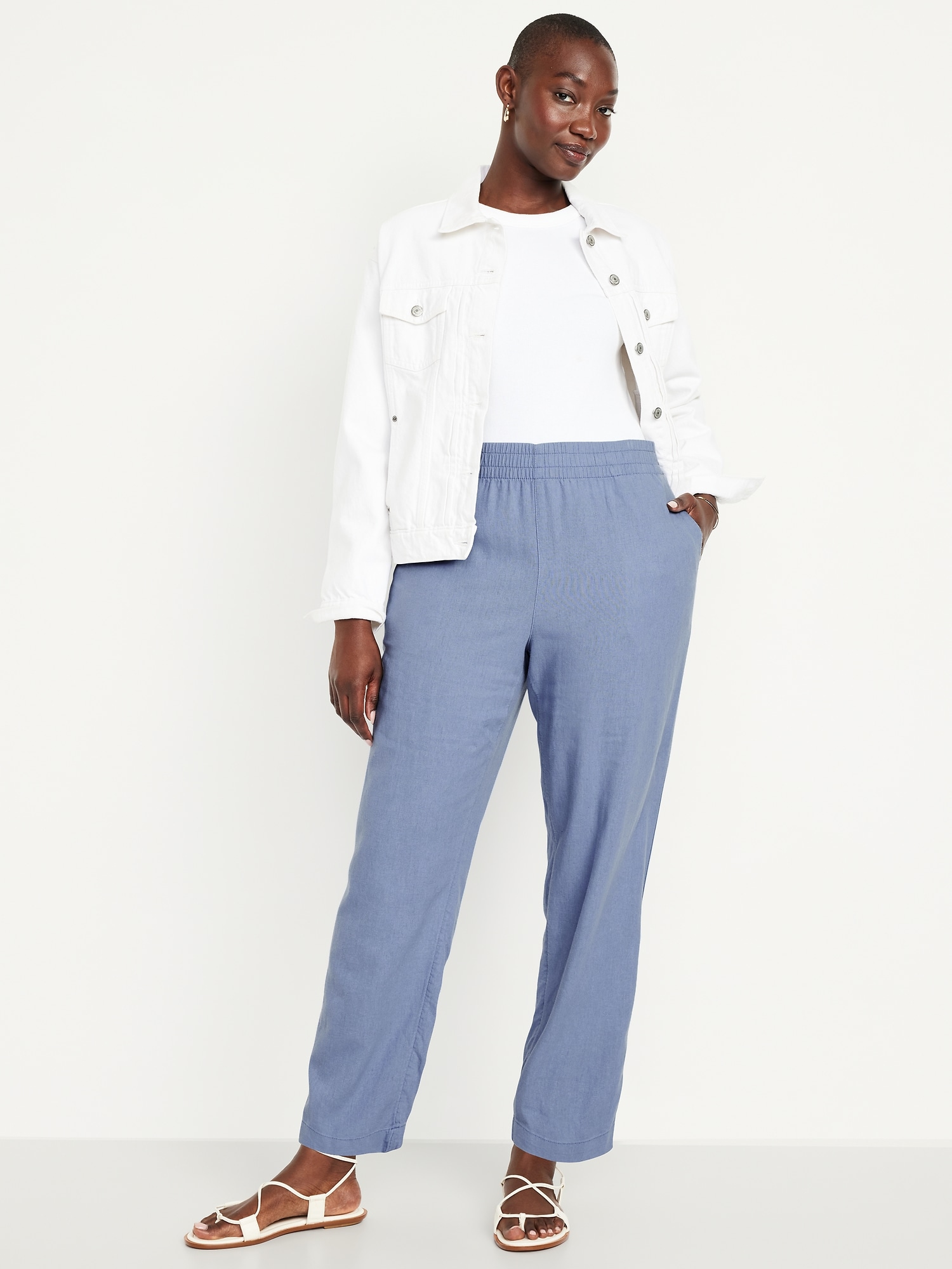 High-Waisted Linen-Blend Straight Ankle Pants: elasticized waistband, on-seam hip pockets, back patch pockets, straight leg, pull-on style, #683297