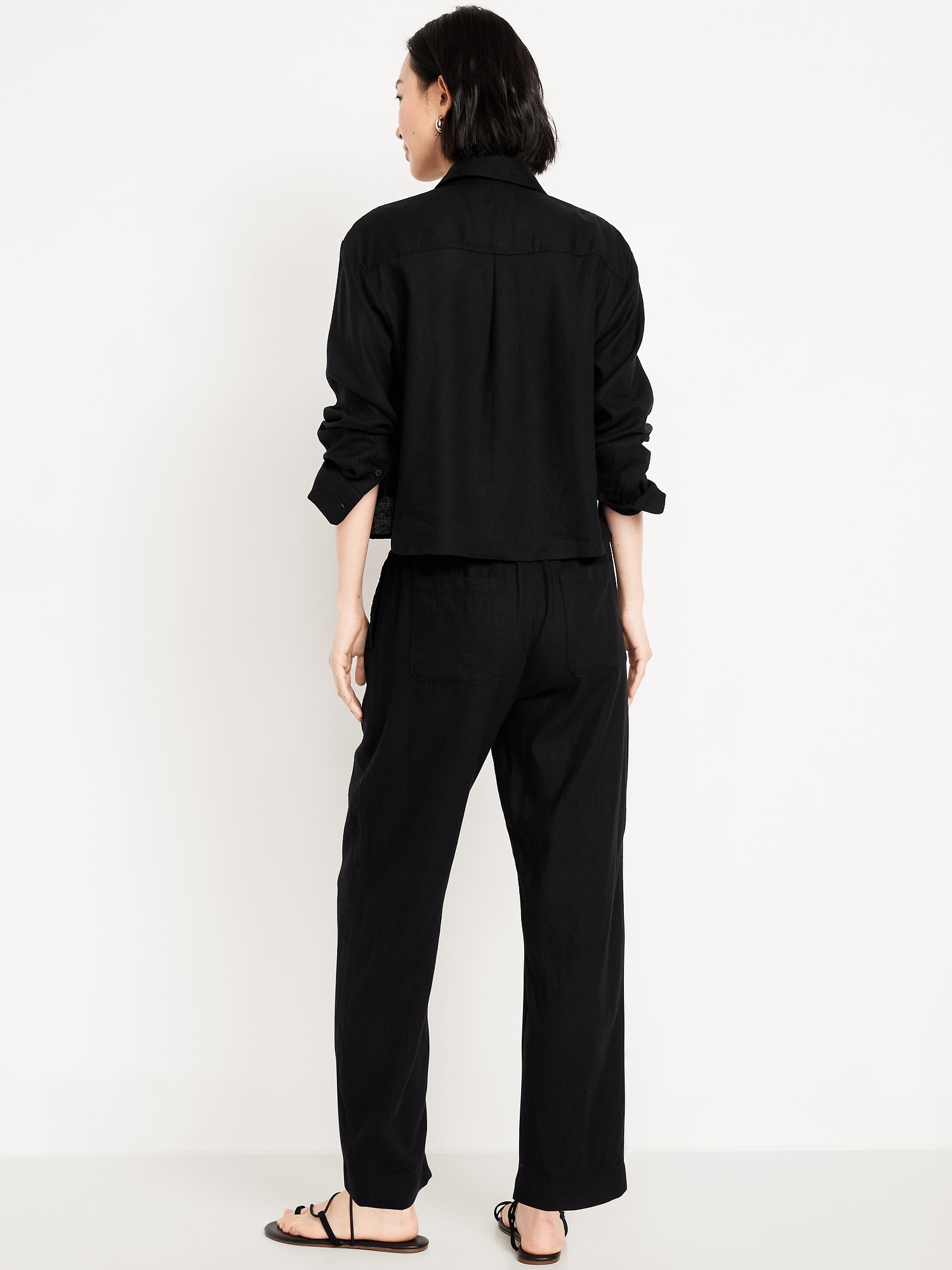 High-Waisted Linen-Blend Straight Ankle Pants: elasticized waistband, on-seam hip pockets, back patch pockets, straight leg, pull-on style, #683297