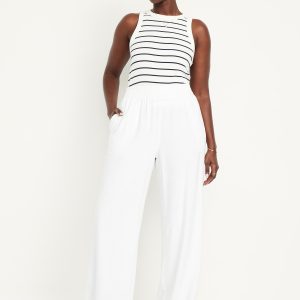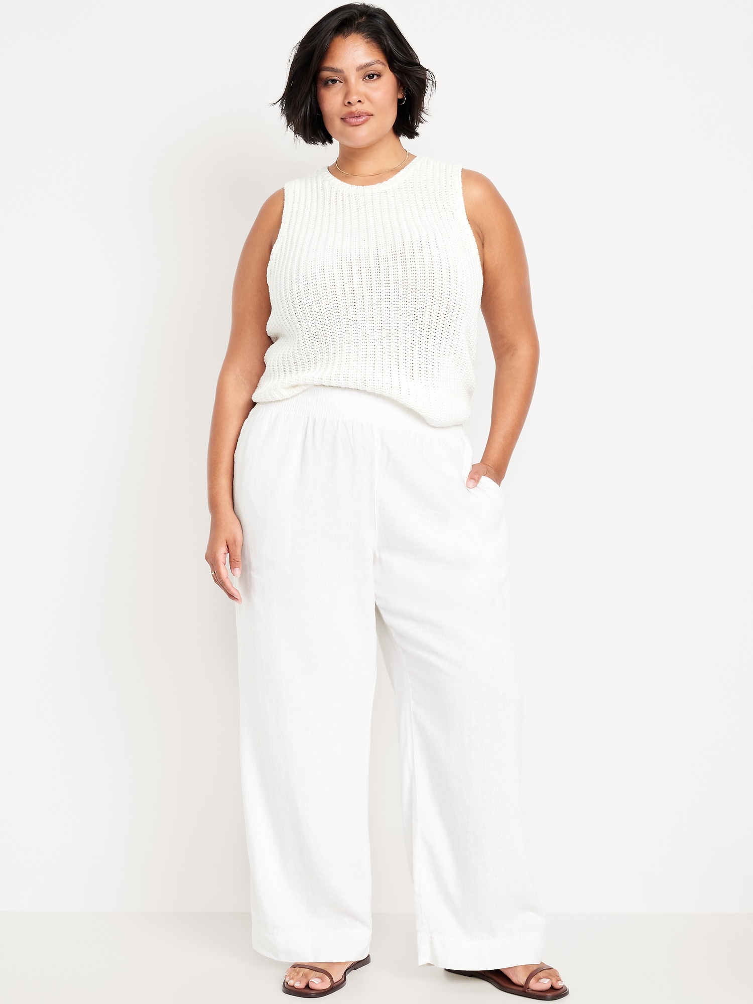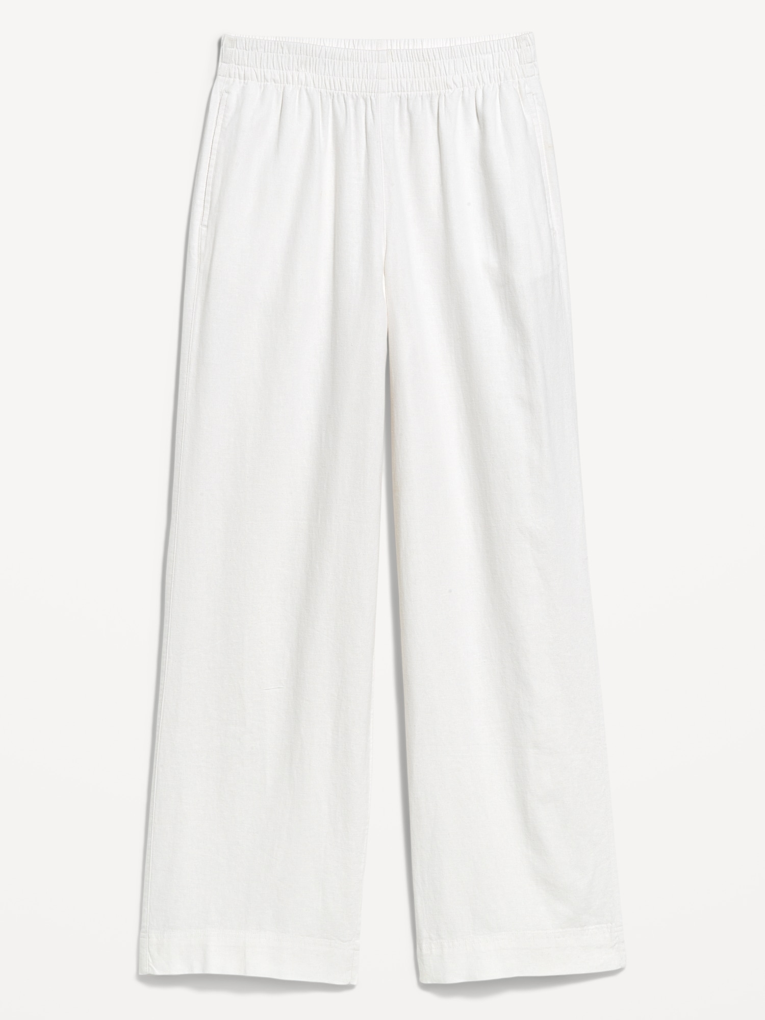 High-Waisted Linen-Blend Wide-Leg Pants: comfort elastic-drawstring waist, side-seam pockets, wide leg, vertical striped print, pull-on style, #766295