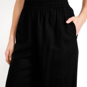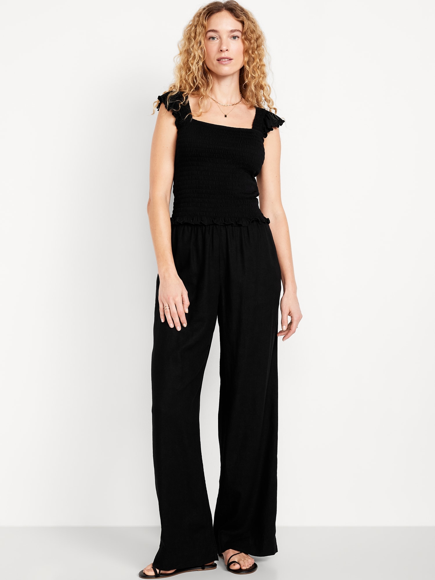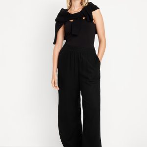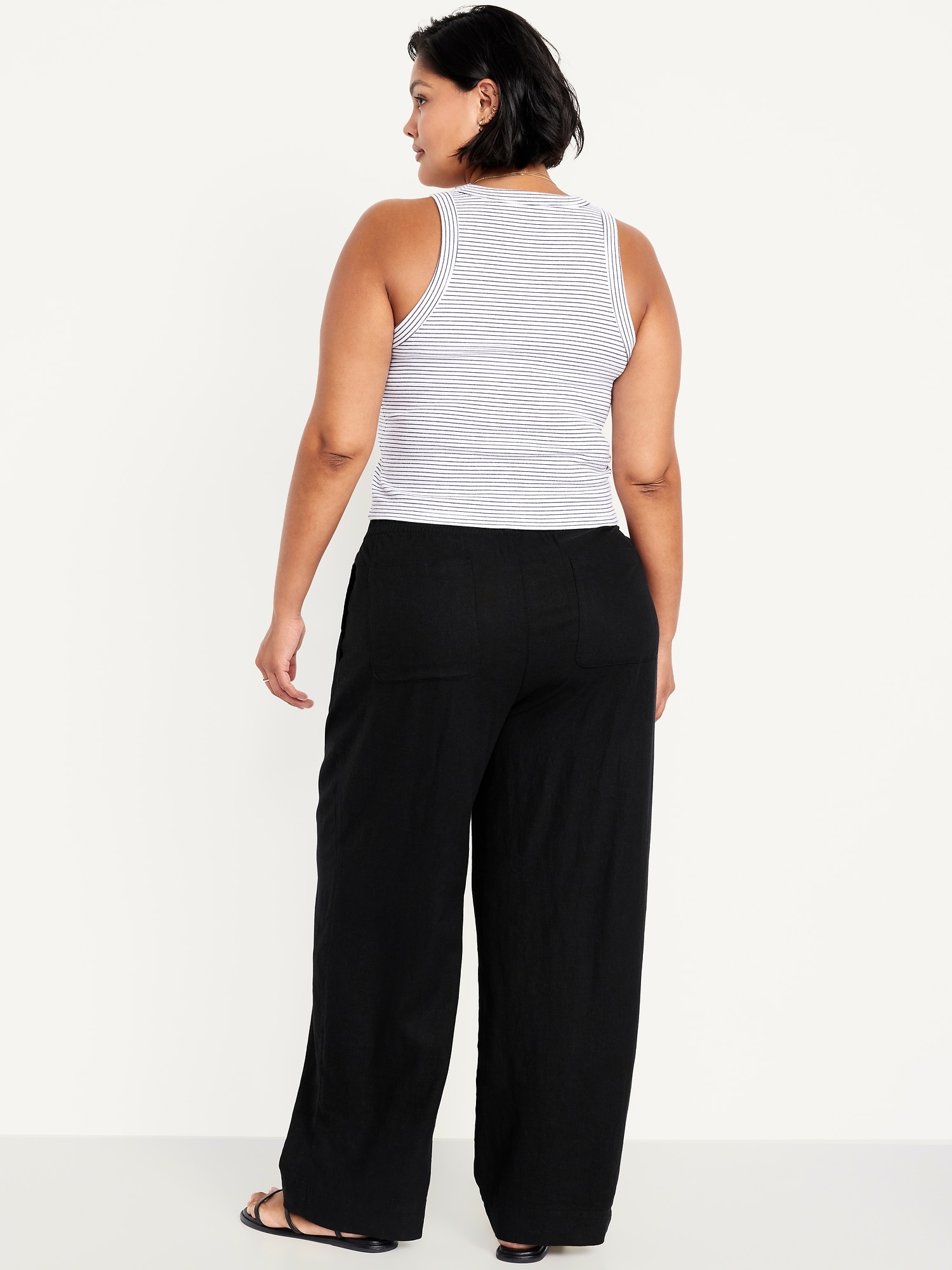 High-Waisted Linen-Blend Wide-Leg Pants: comfort elastic-drawstring waist, side-seam pockets, wide leg, vertical striped print, pull-on style, #766295