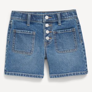 High-Waisted Mariner Midi Jean Shorts for Girls: interior adjustable waistband, sizes 5-8 snap-button closure, sizes 10-20 regular button closure, exposed button fly, patch pockets at front, patch pockets in back, #767091