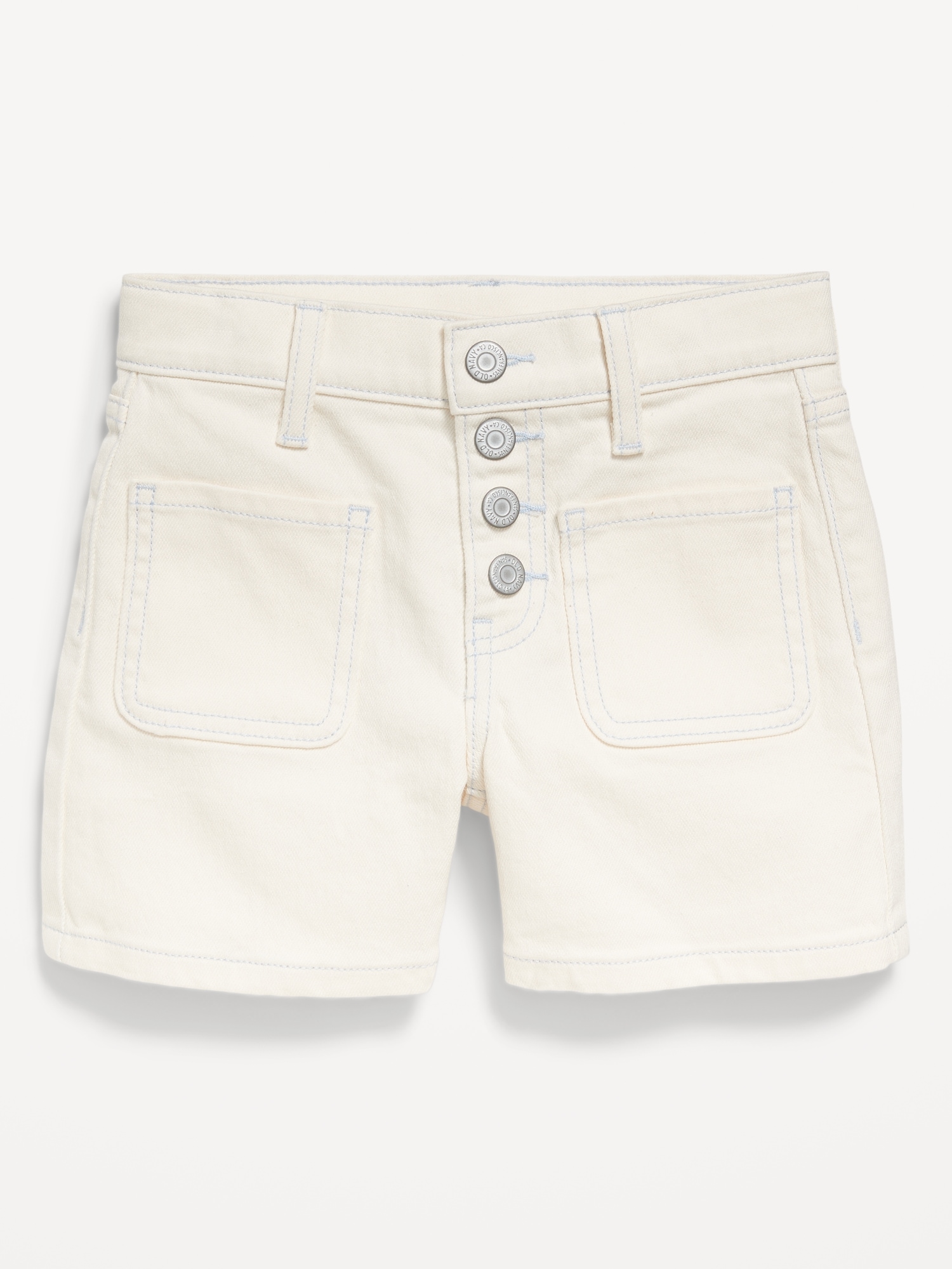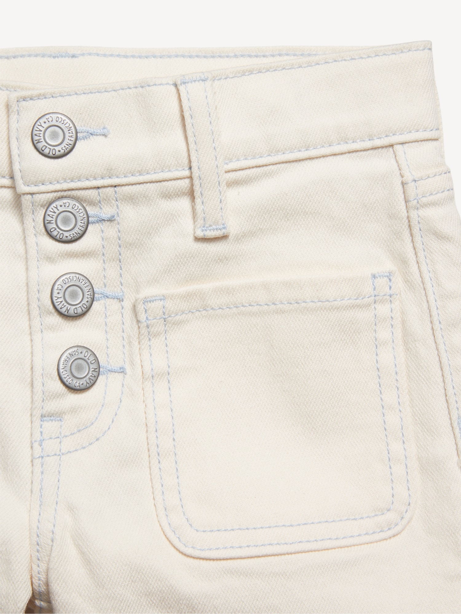 High-Waisted Mariner Midi Jean Shorts for Girls: high rise, sizes 5-8 snap-button closure, sizes 10-20 regular button closure, three-button fly, front mariner pockets, patch pockets at back, #704516
