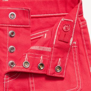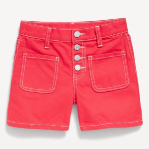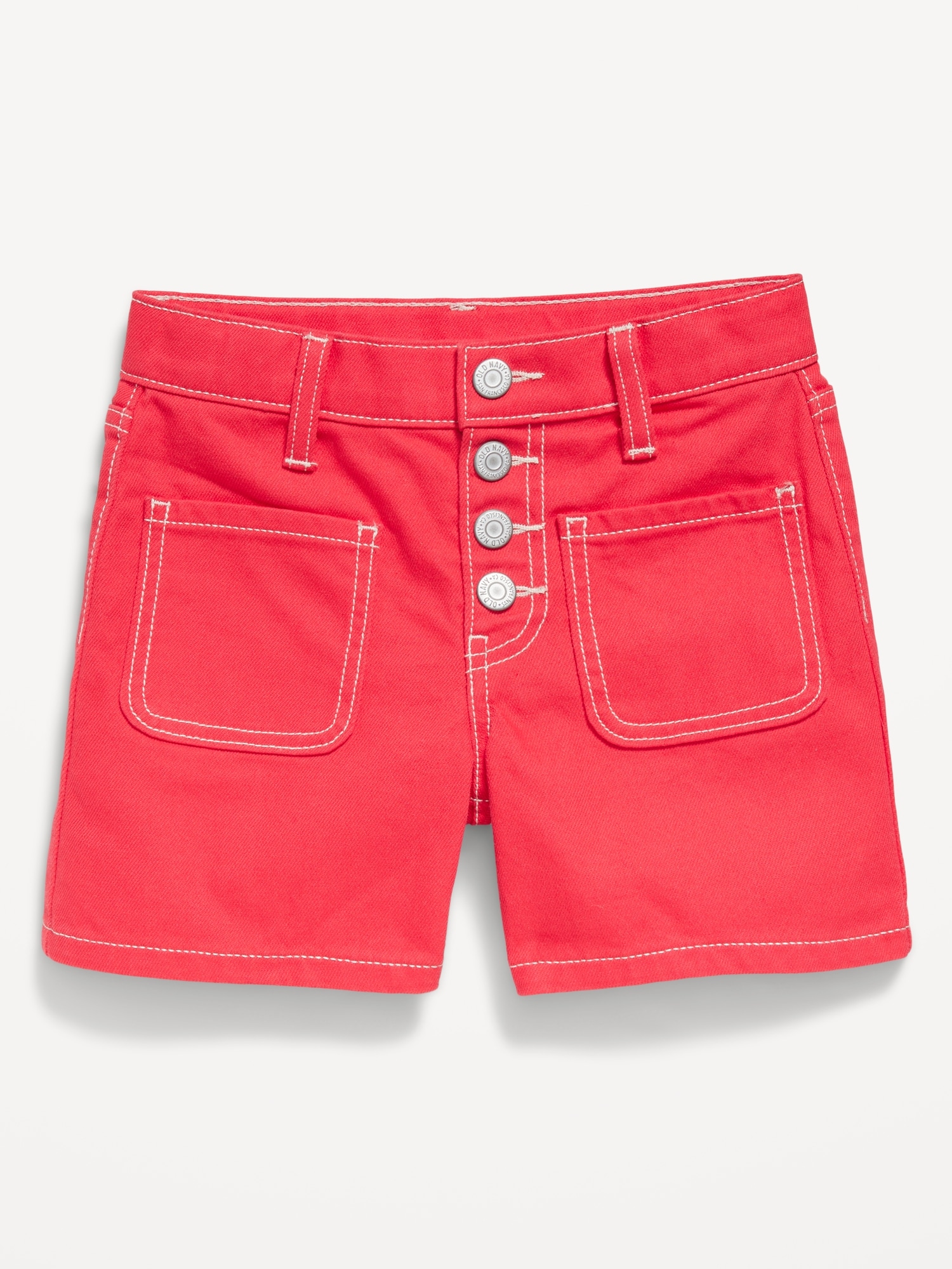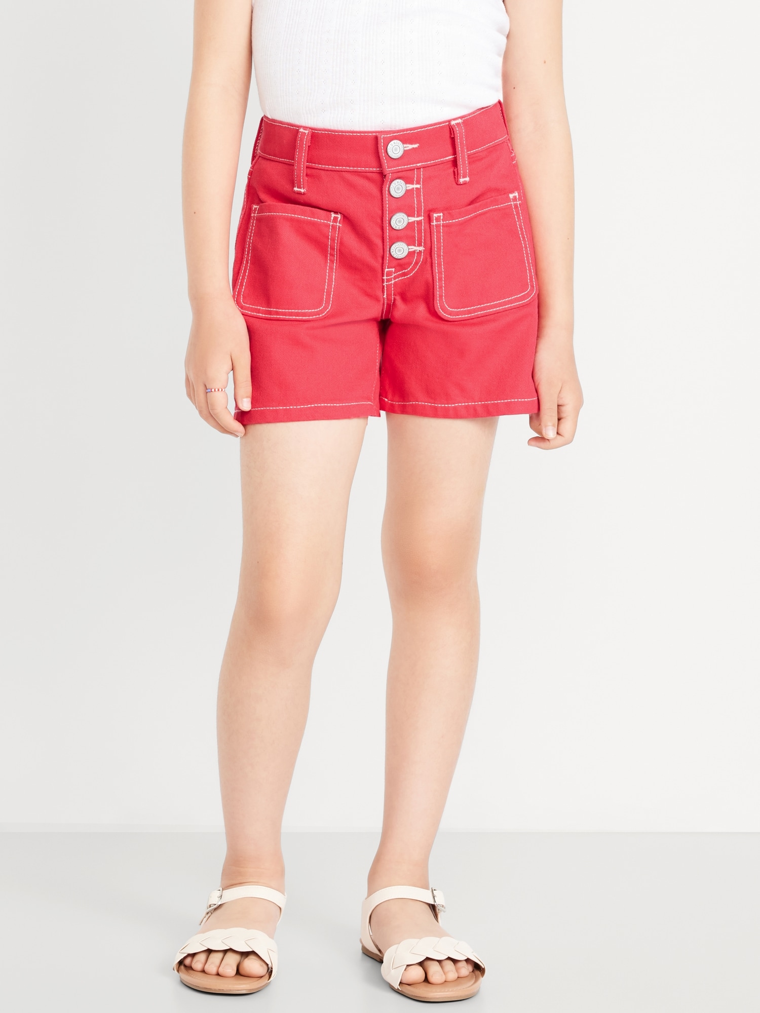 High-Waisted Mariner Midi Jean Shorts for Girls: high rise, sizes 5-8 snap-button closure, sizes 10-20 regular button closure, three-button fly, front mariner pockets, patch pockets at back, #704516