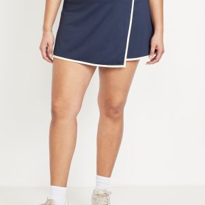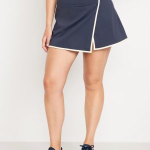 High-Waisted PowerSoft Faux-Wrap Skort: Featuring PowerSoft. Light compression meets a peachy-smooth, sweat-wicking fabric.pull-on waistband, faux-wrap front, built-in bike shorts, mini length, go-dry wicks moisture, breathable, #694169