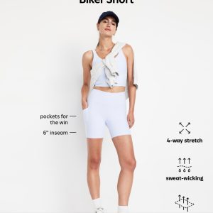 High-Waisted PowerSoft Pocket Biker Shorts — 6-inch inseam: Featuring PowerSoft. Light compression meets a peachy-smooth, sweat-wicking fabric.pull-on waist, side pocket fits your phone, go-dry wicks moisture, #662948