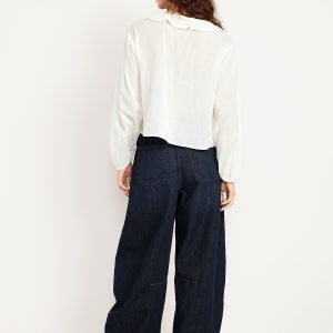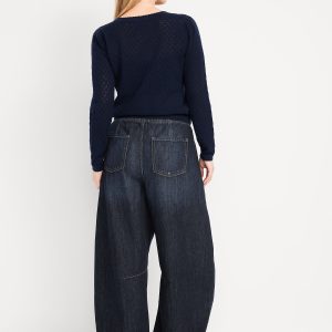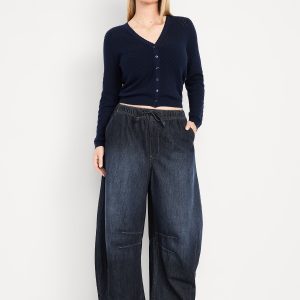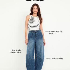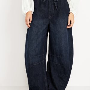 High-Waisted Pull-On Barrel Jeans: A curved, tapered leg and proportion play from hip to hem.elastic-drawstring pull-on waist, diagonal hip pockets, back patch pockets, barrel leg, #789111
