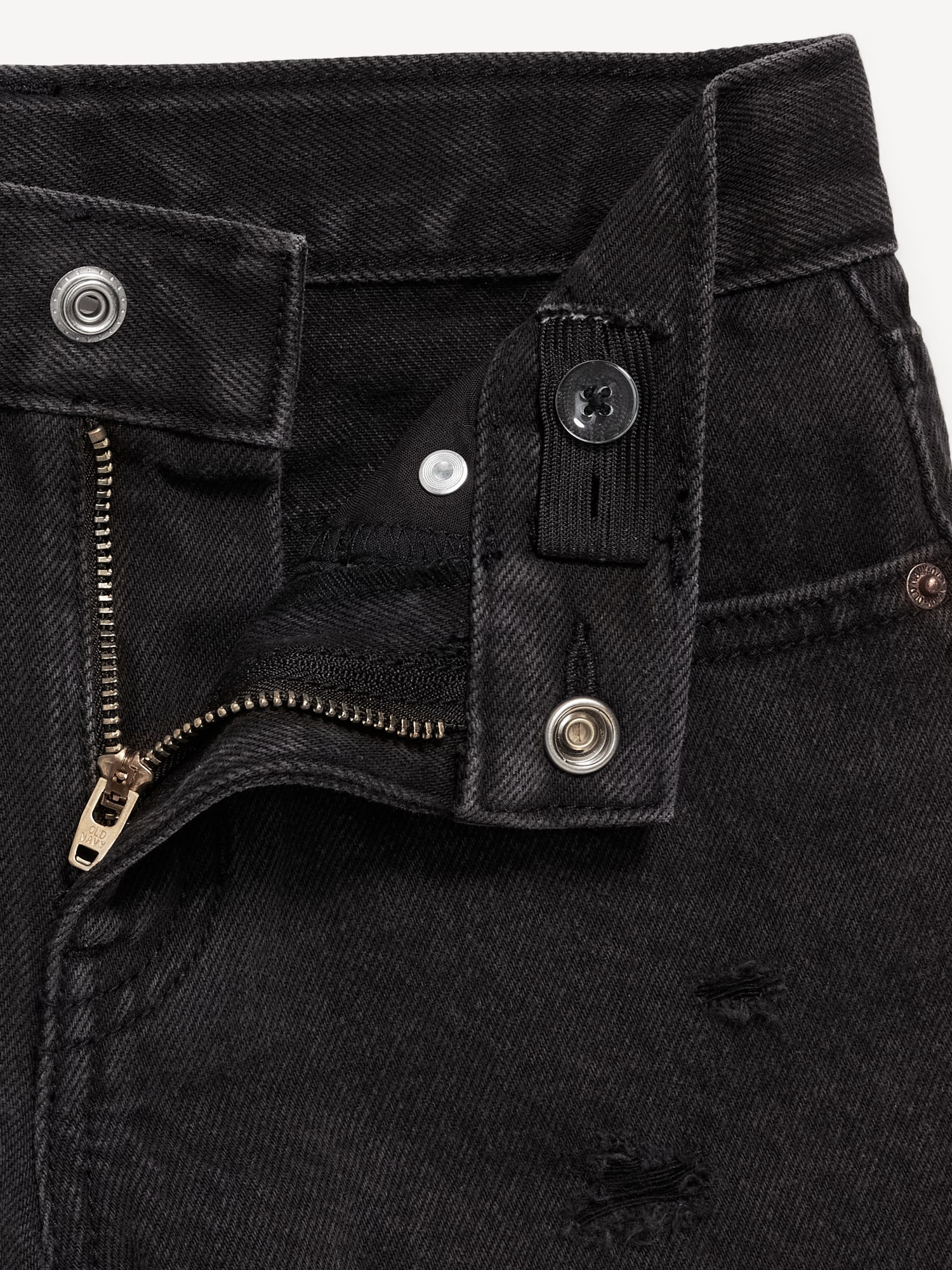 High-Waisted Ripped Frayed-Hem Jean Shorts for Girls: interior adjustable waistband, sizes 5-8 snap-button closure, sizes 10-20 regular button closure, zip fly, scoop pockets and coin pocket in front, patch pockets in back, rips/tears at front for a lived-in look, frayed hem, #855327