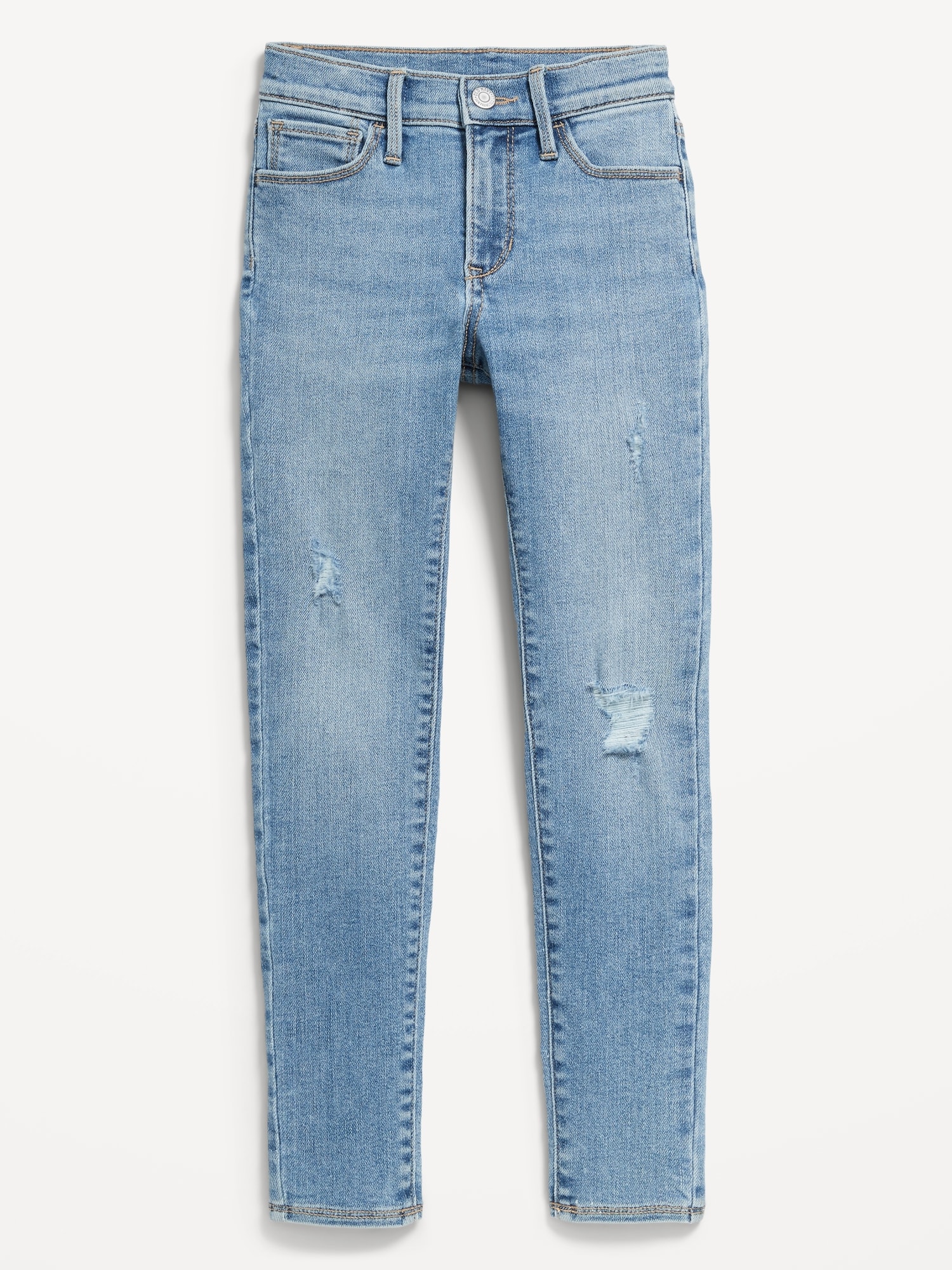 High-Waisted Rockstar 360° Stretch Ripped Jeggings for Girls: The it fits she really, really wants.interior adjustable waistband, snap-button closure in sizes 5-8, regular button closure in sizes 10-20, zip fly, scoop pockets and coin pocket at front, patch pockets at back, #876134