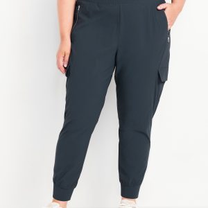 High-Waisted SleekTech Cargo Joggers: Featuring SleekTech. Polished and lightweight, with serious stretch.elastic waist, zippered hip pockets, flap-cargo pockets at thigh, go-dry wicks moisture, breathable, pull-on style, #569700