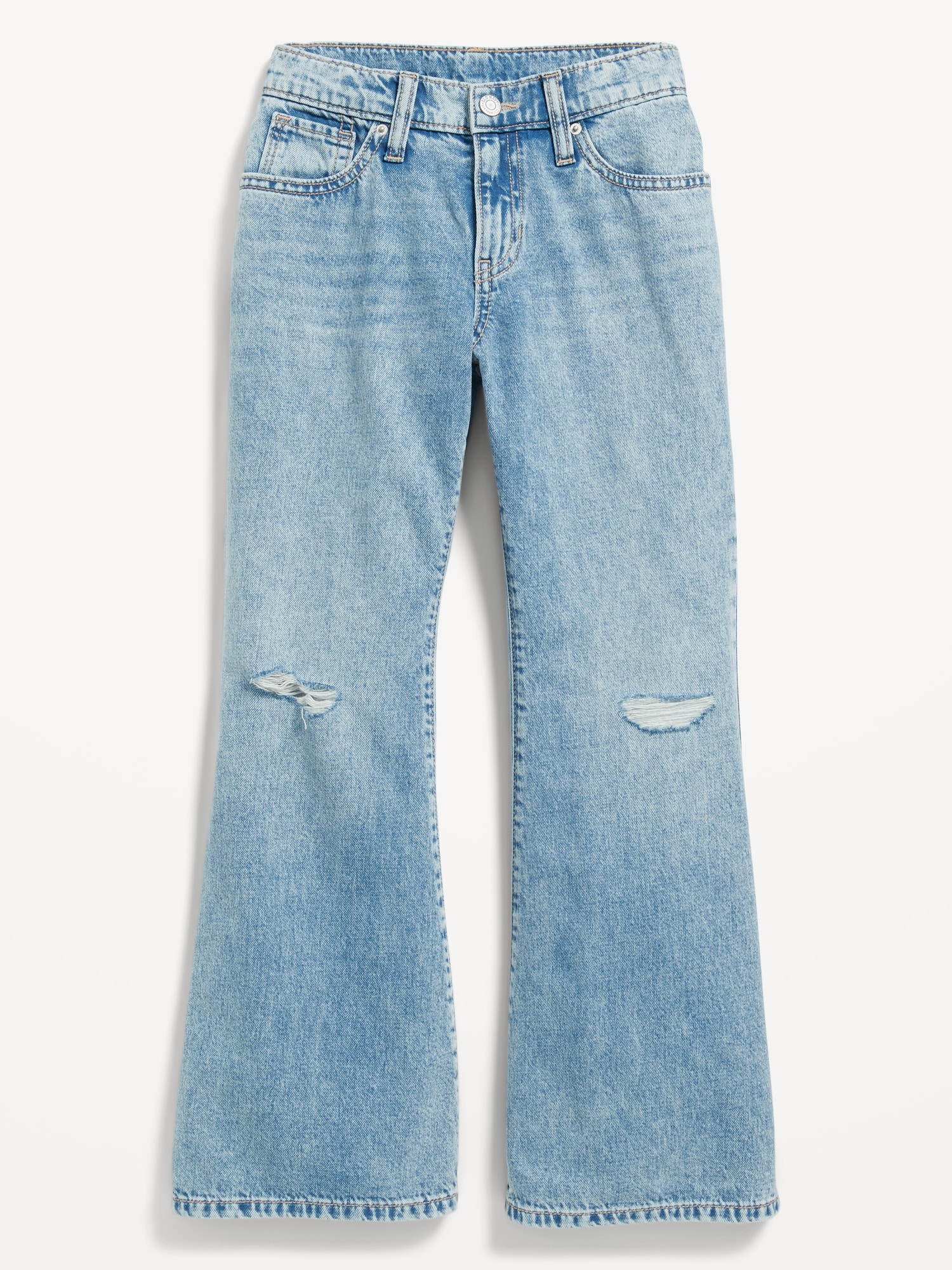 High-Waisted Super Baggy Flare-Leg Jeans for Girls: interior adjustable waistband, sizes 5-8 snap-button closure, sizes 10-20 regular button closure, zip fly, scoop pockets and coin pocket in front, patch pockets in back, flared leg openings, frayed leg cuffs, #704532