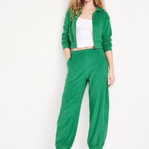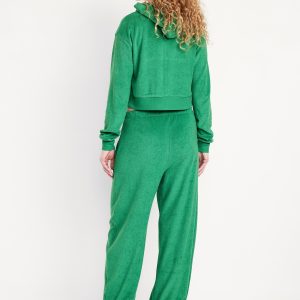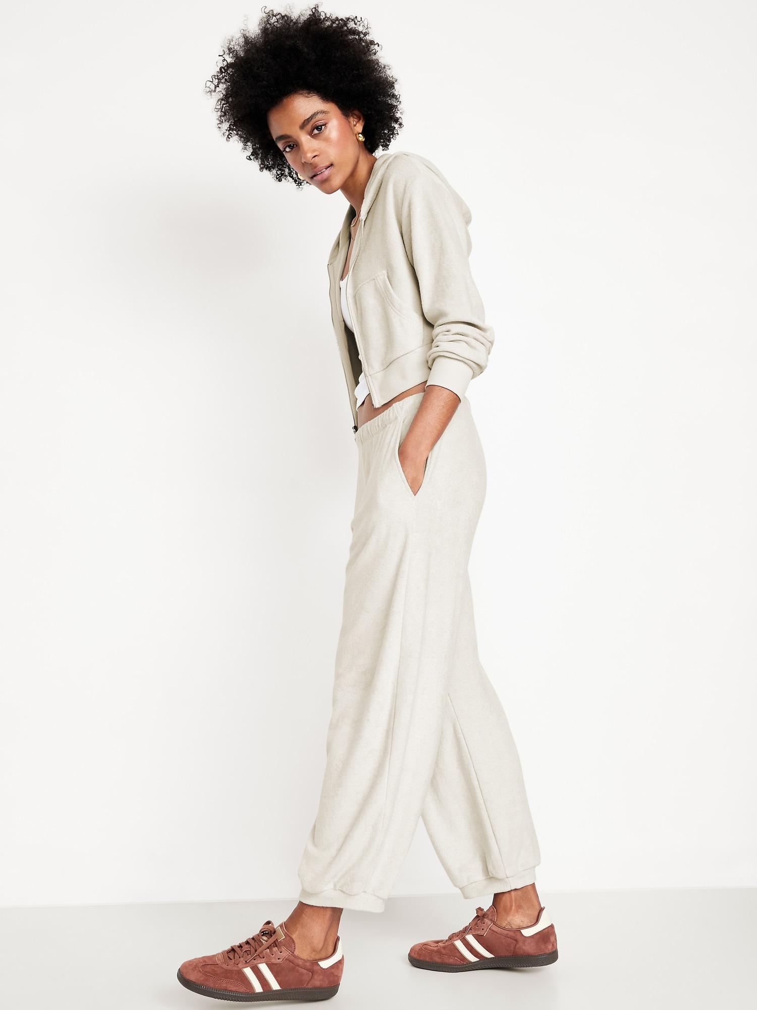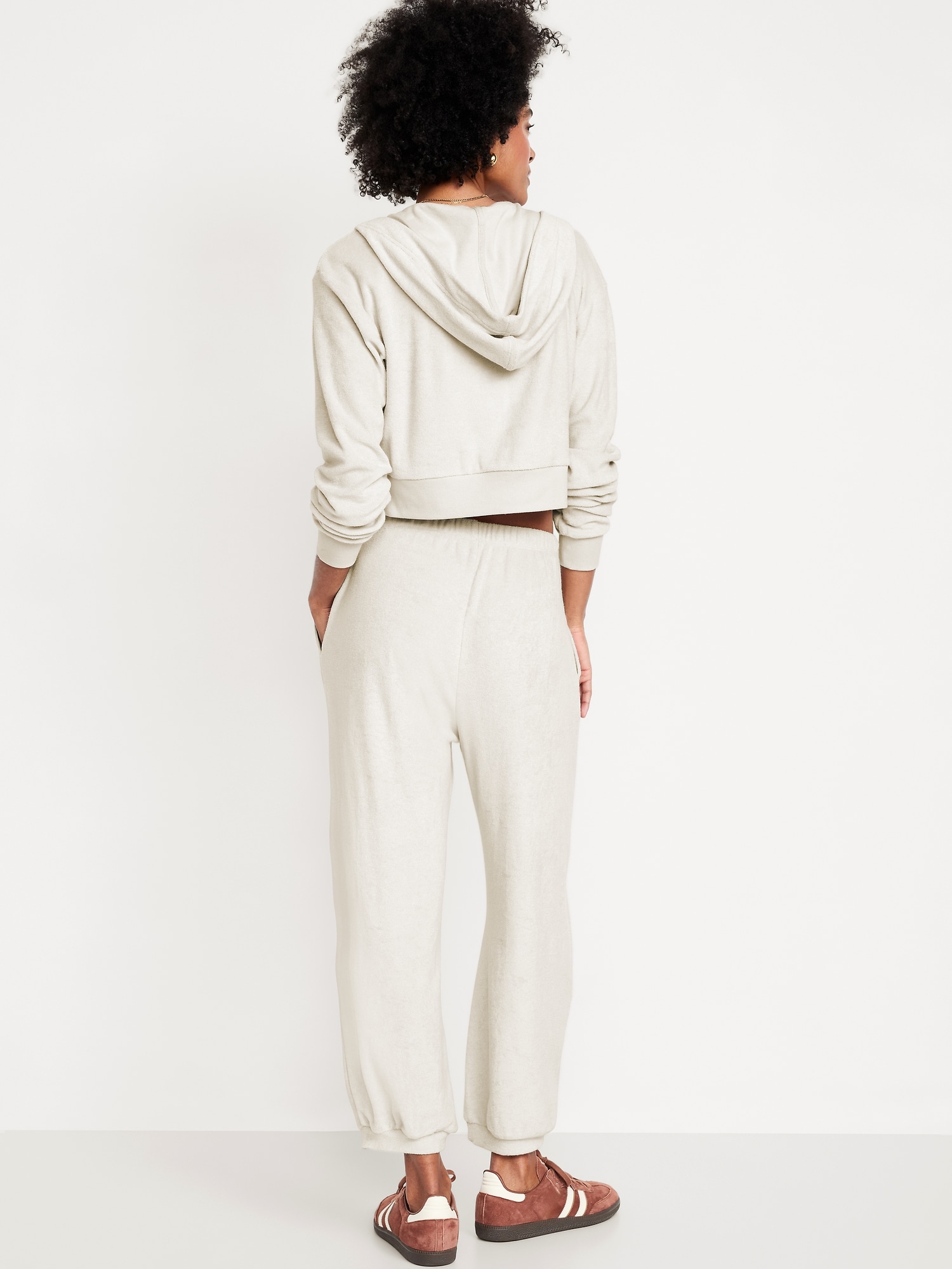 High-Waisted Towel Terry Barrel Ankle Pants: elastic waistband, on-seam pockets, cuffed barrel leg, #749658