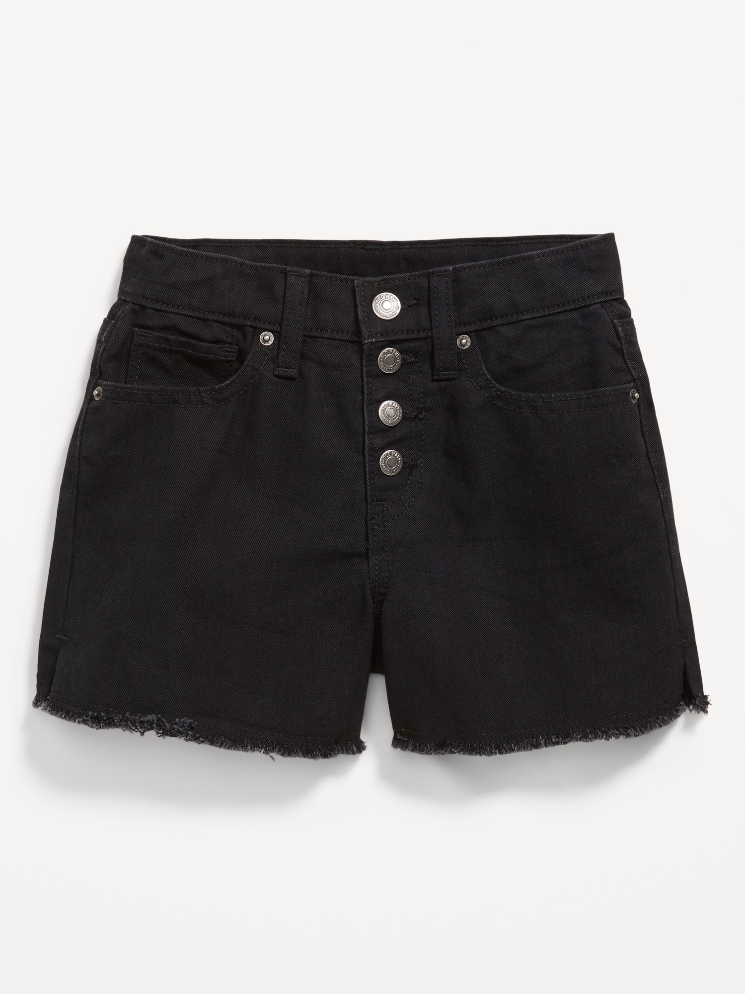 High-Waisted Wow Frayed-Hem Jean Shorts for Girls: contoured interior adjustable waistband, sizes 5-8 snap-button closure, sizes 10-20 regular button closure, regular 3 button-fly closure sizes 10-20, snap-button 3 button-fly closure sizes 5-8, scoop pockets and coin pocket at front, patch pockets at back, frayed leg openings create a lived-in look, side slits, #418243