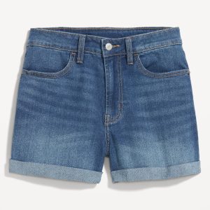 High-Waisted Wow Jean Shorts — 3-inch inseam: button front, belt loops, zip fly, front scoop pockets, back patch pockets, cuffed hem, #890124
