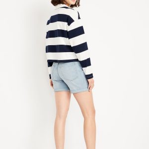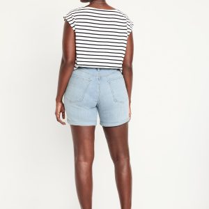 High-Waisted Wow Jean Shorts — 5-inch inseam: button front, zip fly, zip fly, front scoop pockets, back patch pockets, cuffed hem, #849408