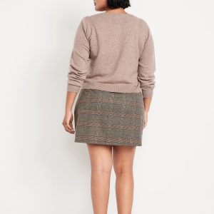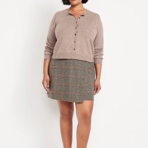 High-Waisted Wrap-Front Mini Skirt: wrap front, left side zipper, darted back, plaid print, #804477
