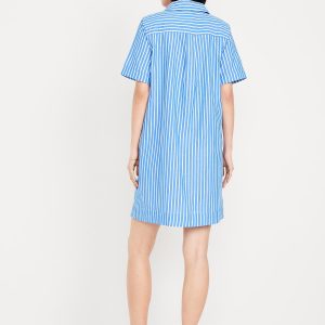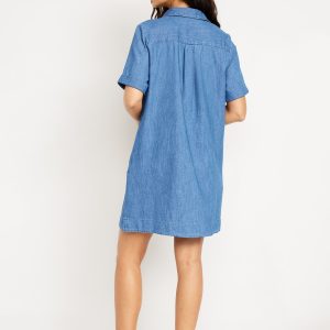 Jean Shirt Dress: spread collar, short sleeves, side-seam pockets, patch chest pocket, full-button front, #705355