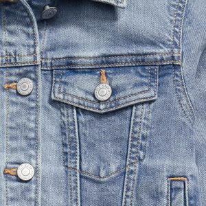 Jean Trucker Jacket for Girls: Notched collar., Long sleeves, with buttoned cuffs., Seamed yoke., Decorative button-flap pockets at chest., Full-length buttoned placket., Vertical welt pockets., Soft cotton denim, with comfortable stretch., We’ve updated the fabric content on select colors & patterns of this style. Select inventory may reflect a slightly different fabric content of 91% cotton, 7% recycled cotton, 2% spandex., #737779