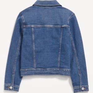 Jean Trucker Jacket for Girls: notched collar, long sleeves, seamed yoke, button-flap pockets at chest, full-length buttoned placket, vertical welt pockets, #424029