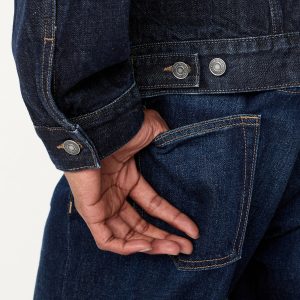 Jean Trucker Jacket: spread collar, long sleeves, buttoned cuffs, full-button front, button-flap chest pockets, vertical welt pockets, hanging loop, #800313