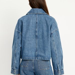 Jean Zip Jacket: spread collar, drop-shoulder sleeves with snap cuffs, full-zip front, welt pockets, cinched hem, #790492