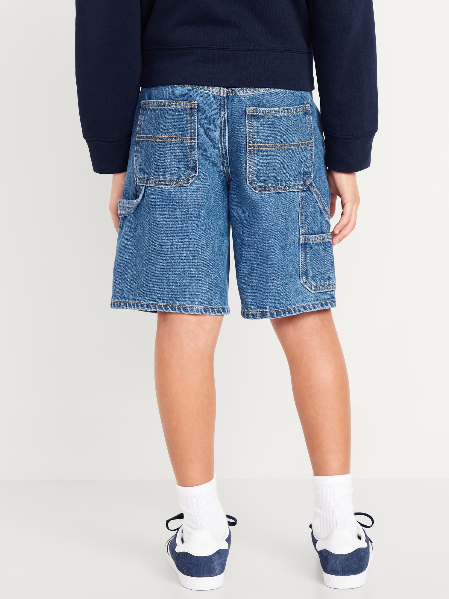 Knee Length Baggy Carpenter Jean Shorts for Boys: interior adjustable waistband, snap-button closure in sizes 5-8, regular button closure in sizes 10-20, zip fly, diagonal pockets at front, utility patch pockets at back and side of leg, built-in hammer loop at left leg, #681352