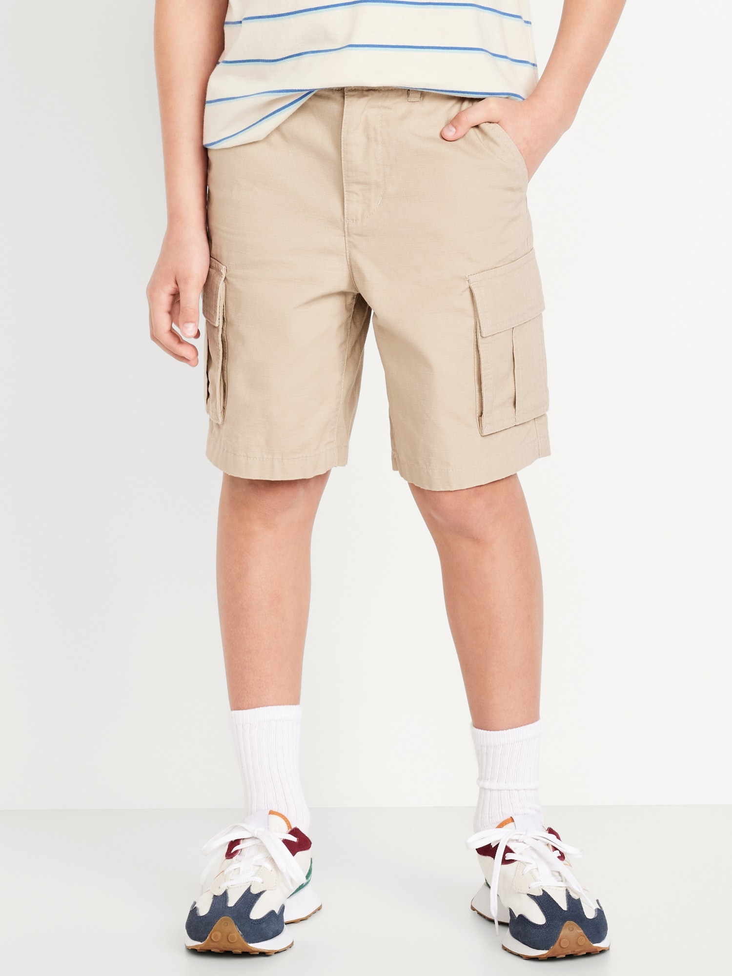 Knee Length Cargo Ripstop Shorts for Boys: interior adjustable waistband, button closure, zip fly, diagonal on-seam pockets, snap-button cargo pockets at each leg, single patch pocket at back, all-over print or solid color, #681416